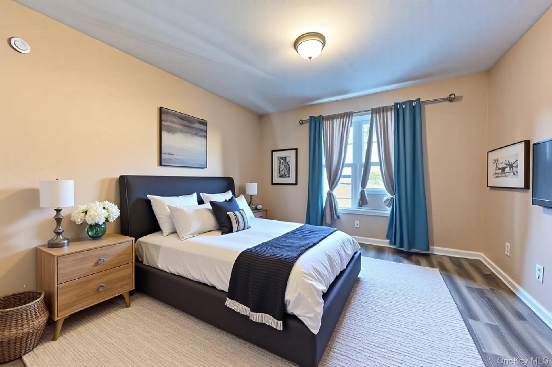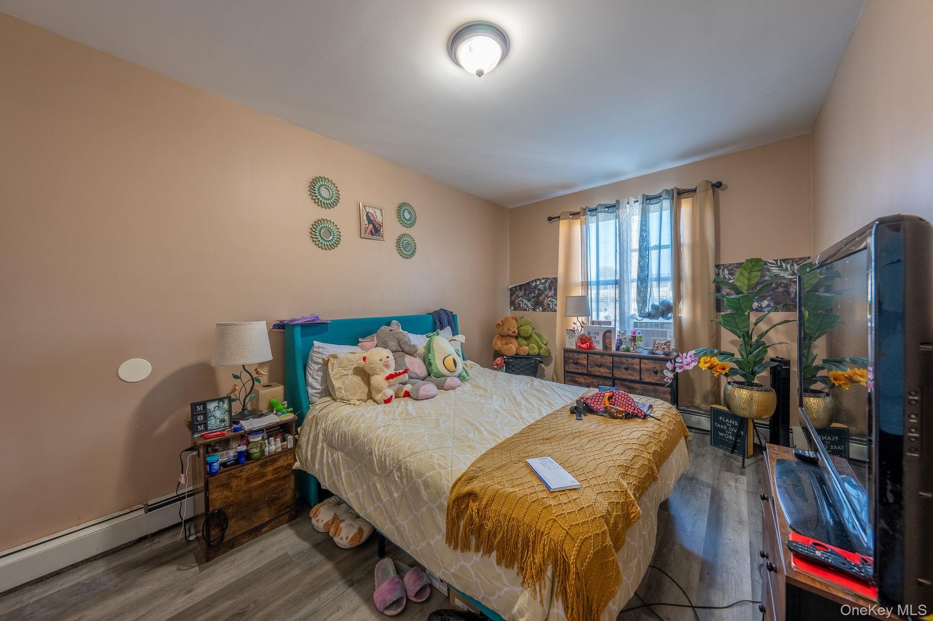 - Bedroom featuring wood finished floors and a baseboard radiator