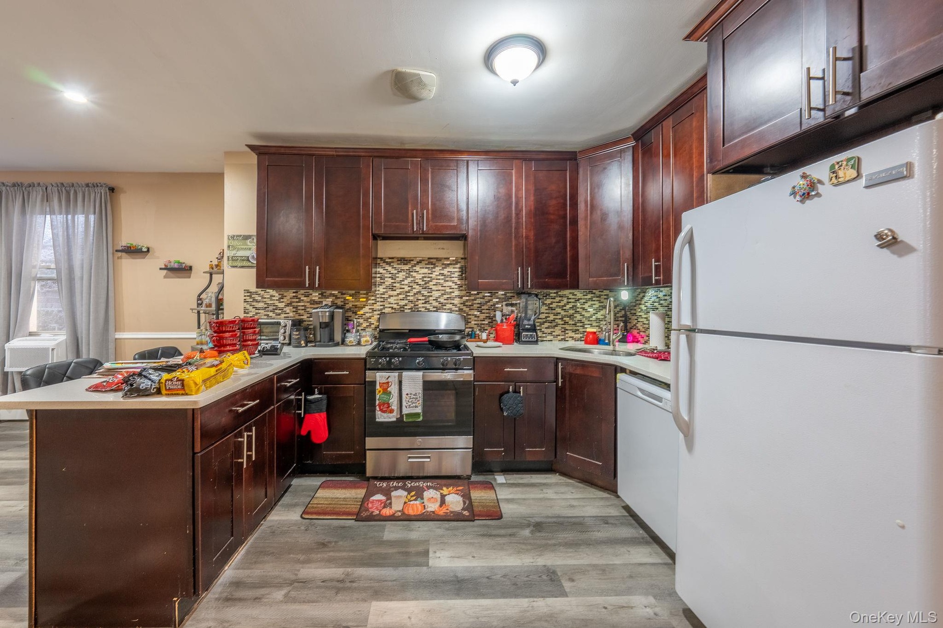 - Kitchen with white appliances, a peninsula, light countertops, light wood finished floors, and tasteful backsplash