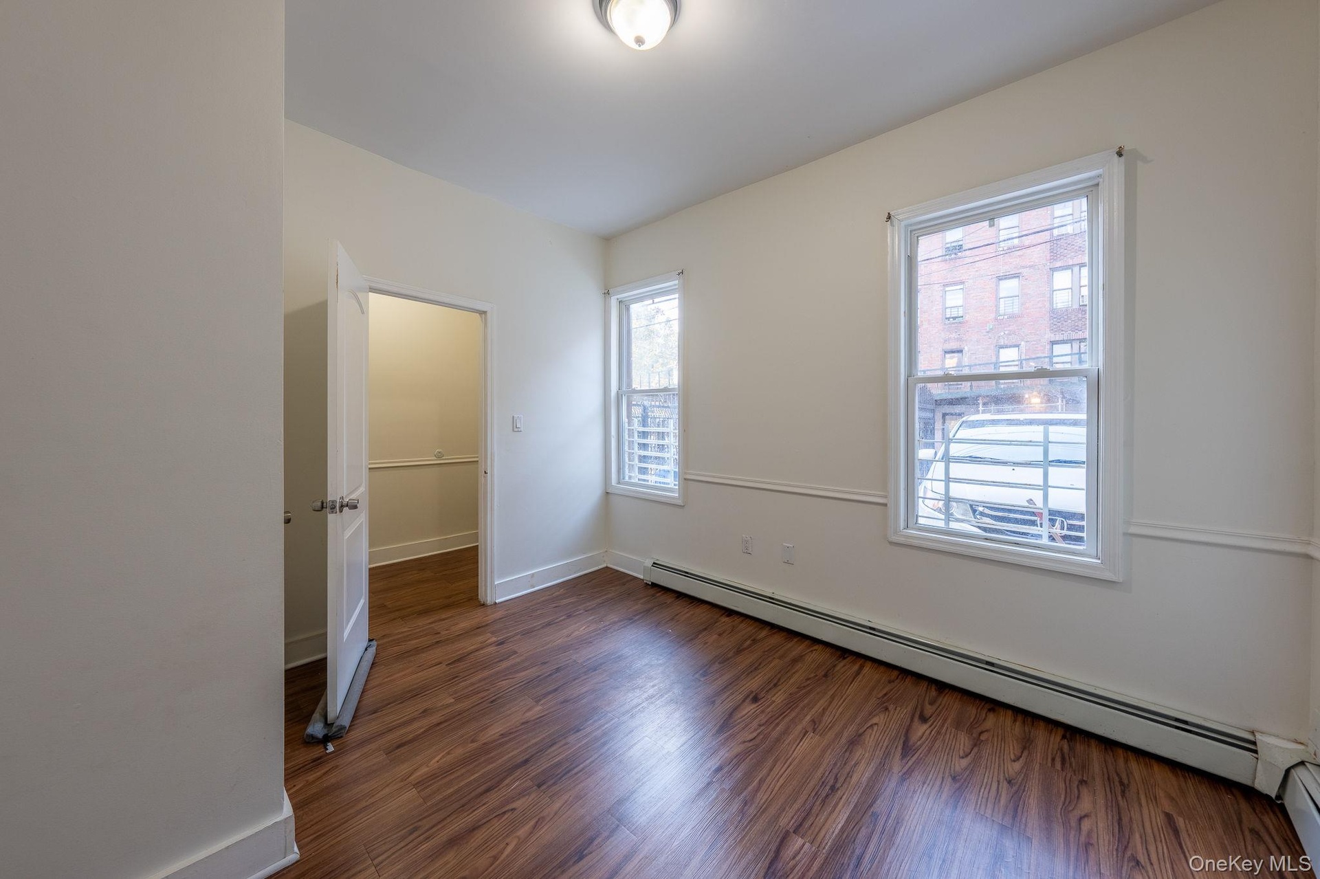 - Unfurnished bedroom featuring a baseboard radiator and dark wood-type flooring