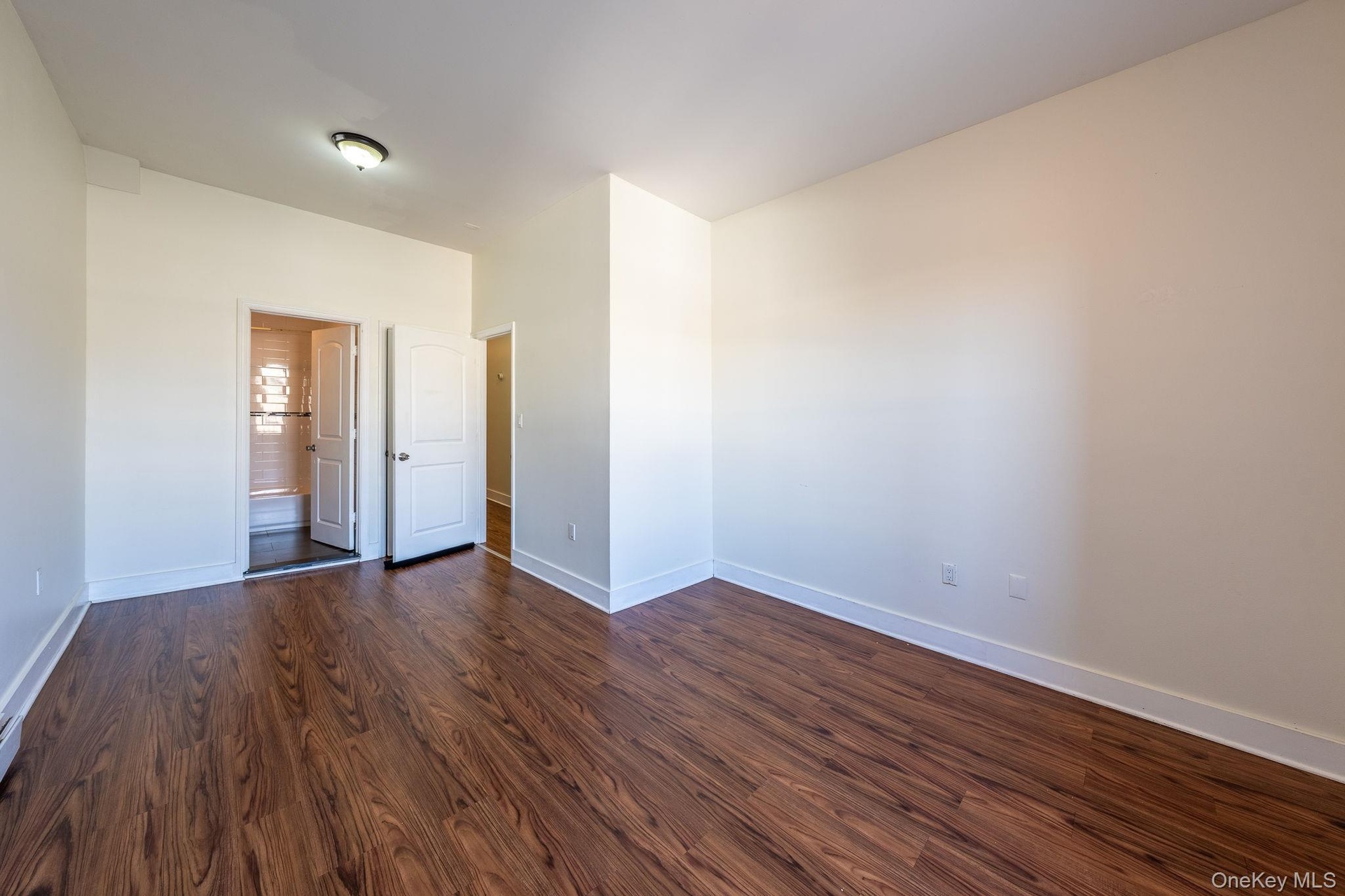 - Empty room with a baseboard heating unit and dark wood-style flooring