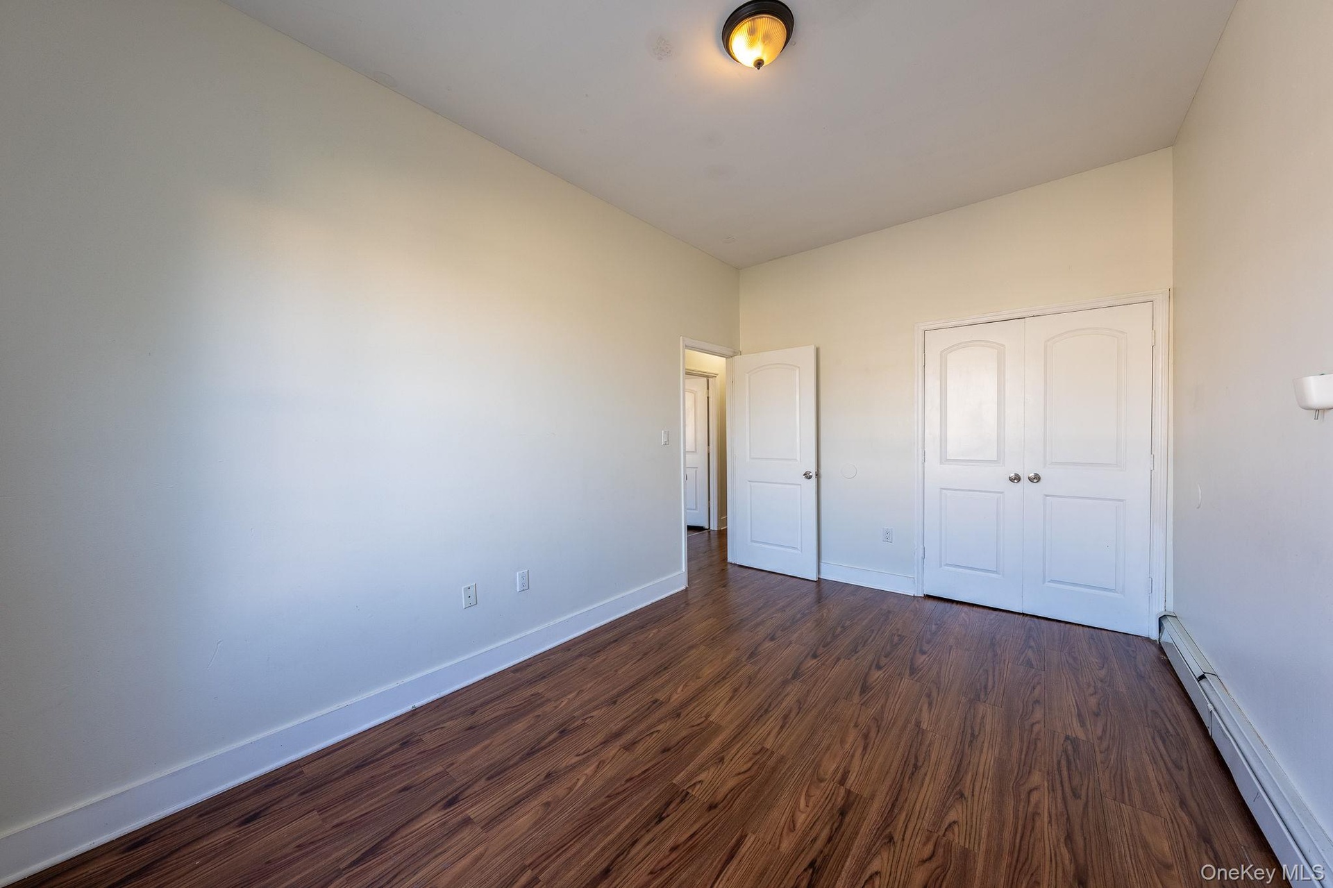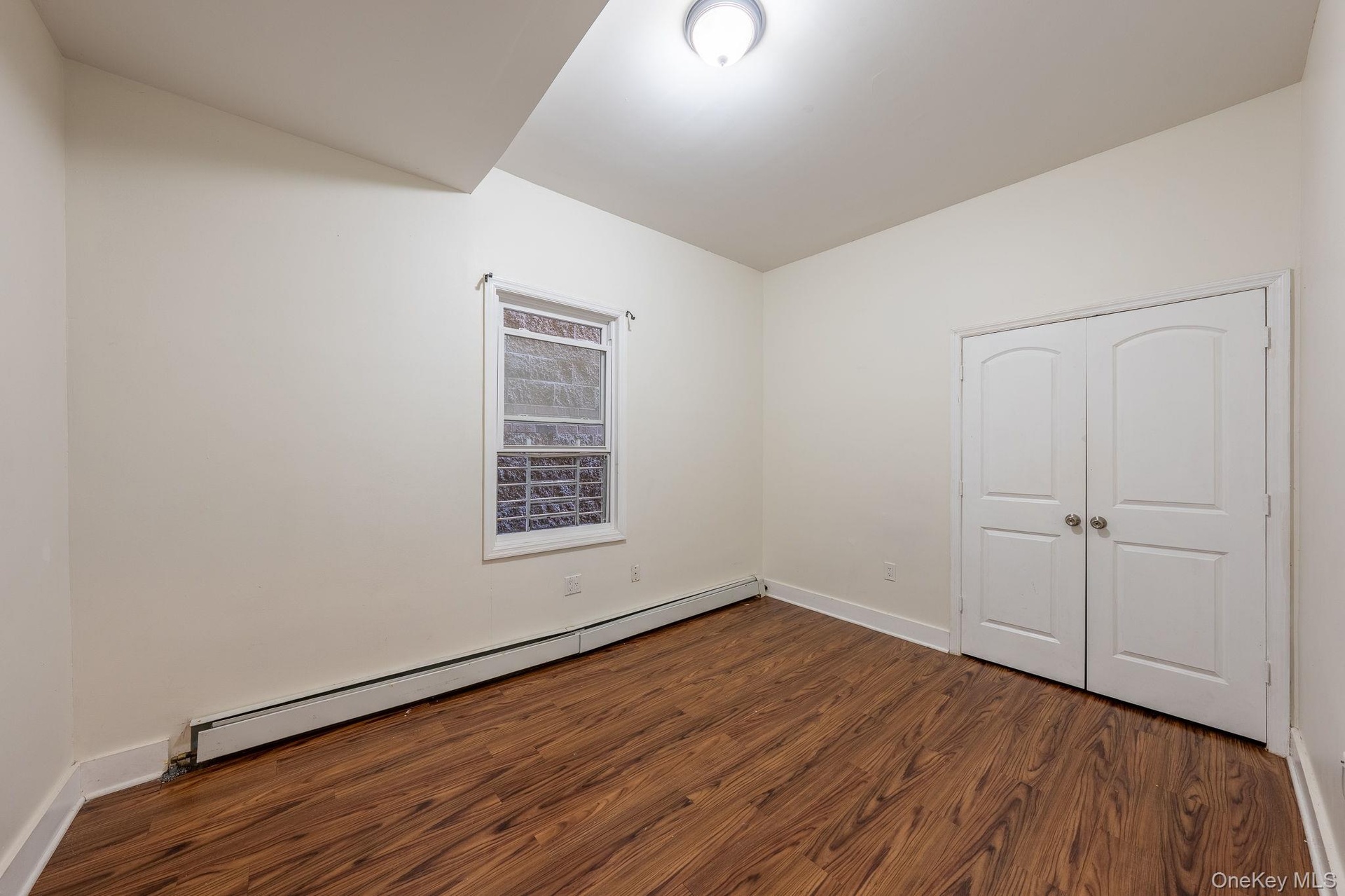 - Unfurnished bedroom with baseboard heating, dark wood-style flooring, and a closet