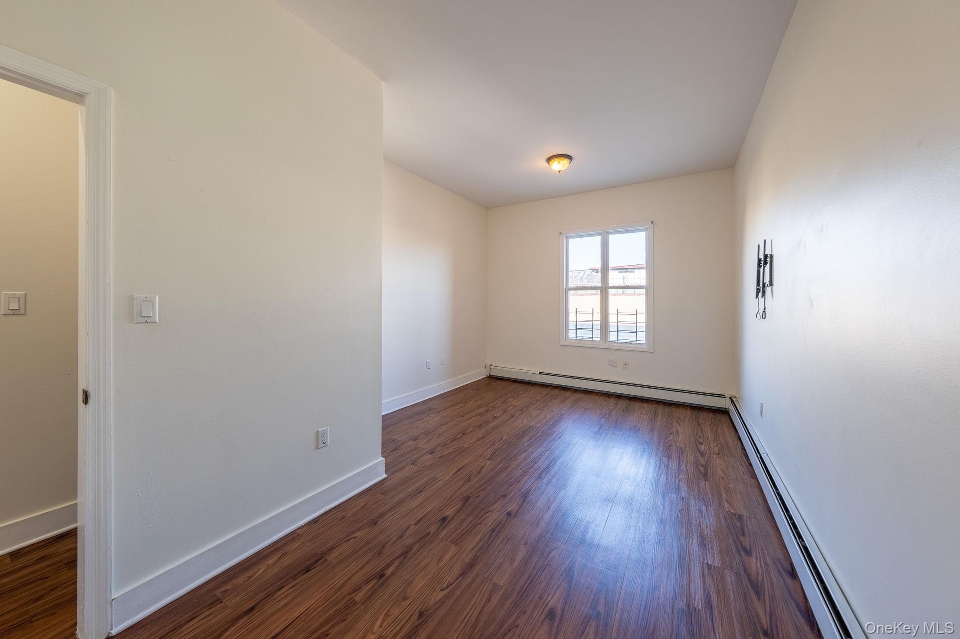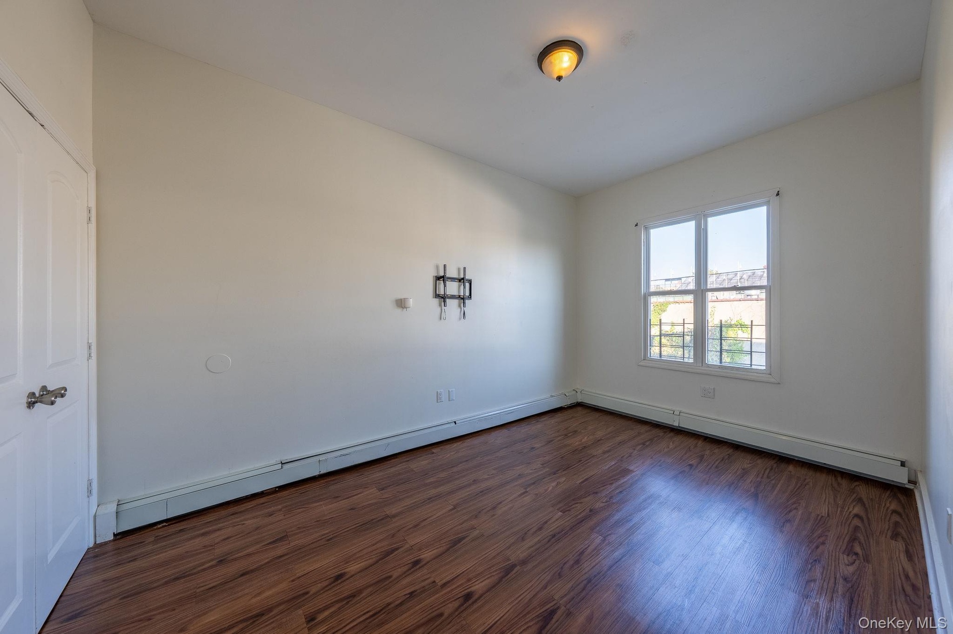 - Unfurnished room with dark wood-type flooring, a baseboard heating unit, and a baseboard radiator