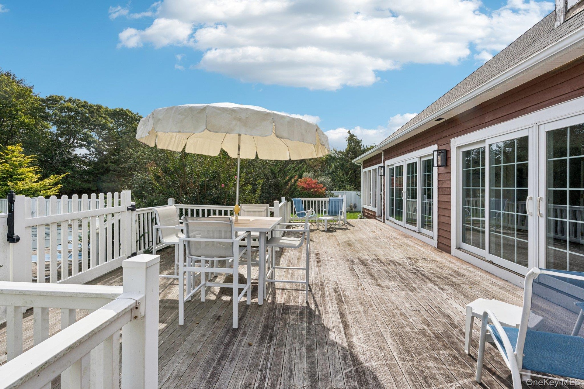- Expansive mahogany deck featuring an inviting outdoor dining area with seamless access through sliding glass doors.