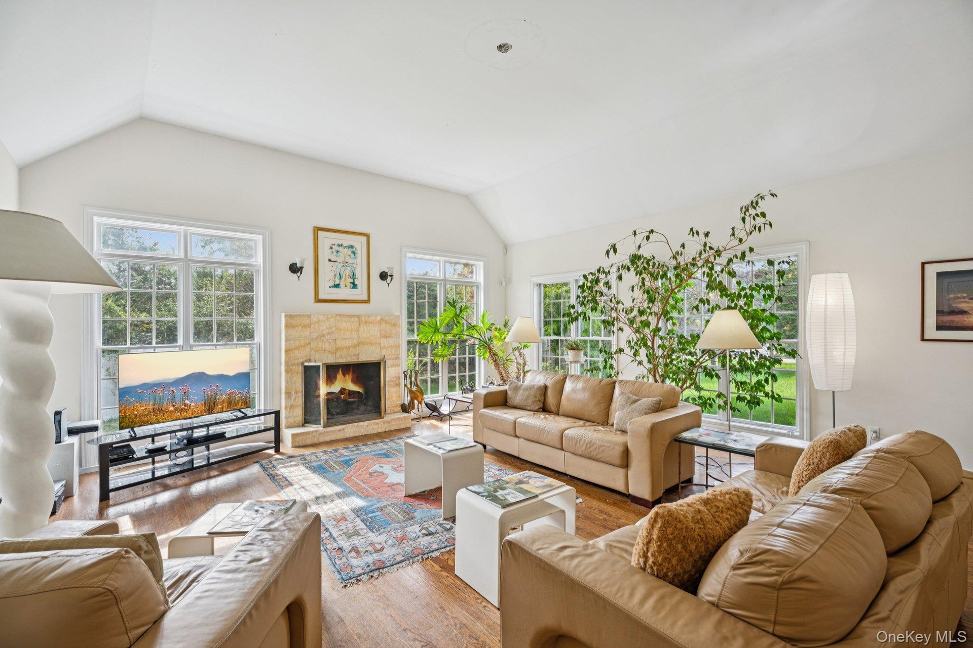- An exquisite living area showcasing vaulted ceilings, rich oak hardwood floors, and a timeless wood-burning fireplace, beautifully encased in floor-to