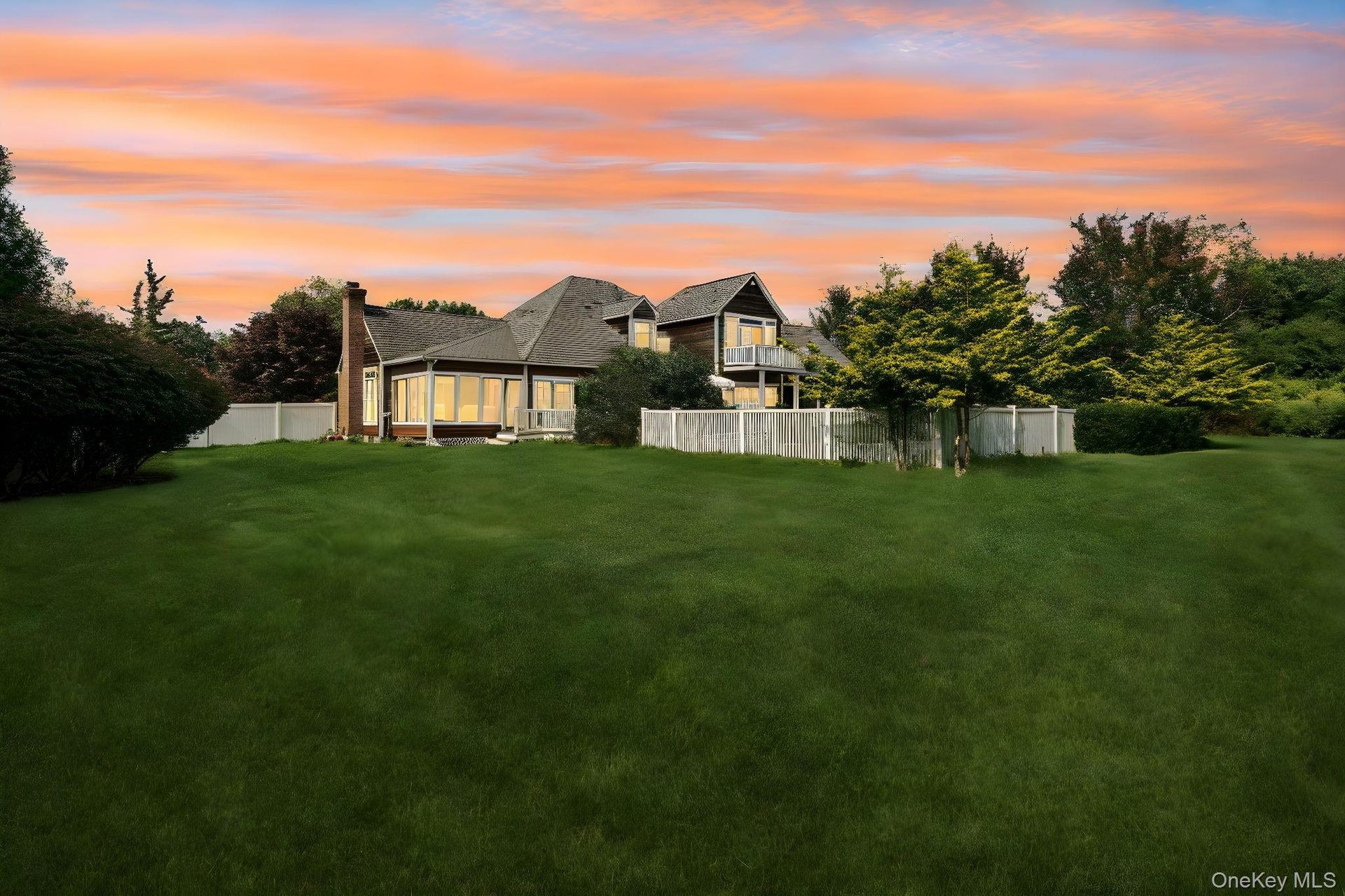 - A twilight view of the home’s rear elevation, featuring the fenced backyard, classic chimney, and inviting glow of the sunroom.