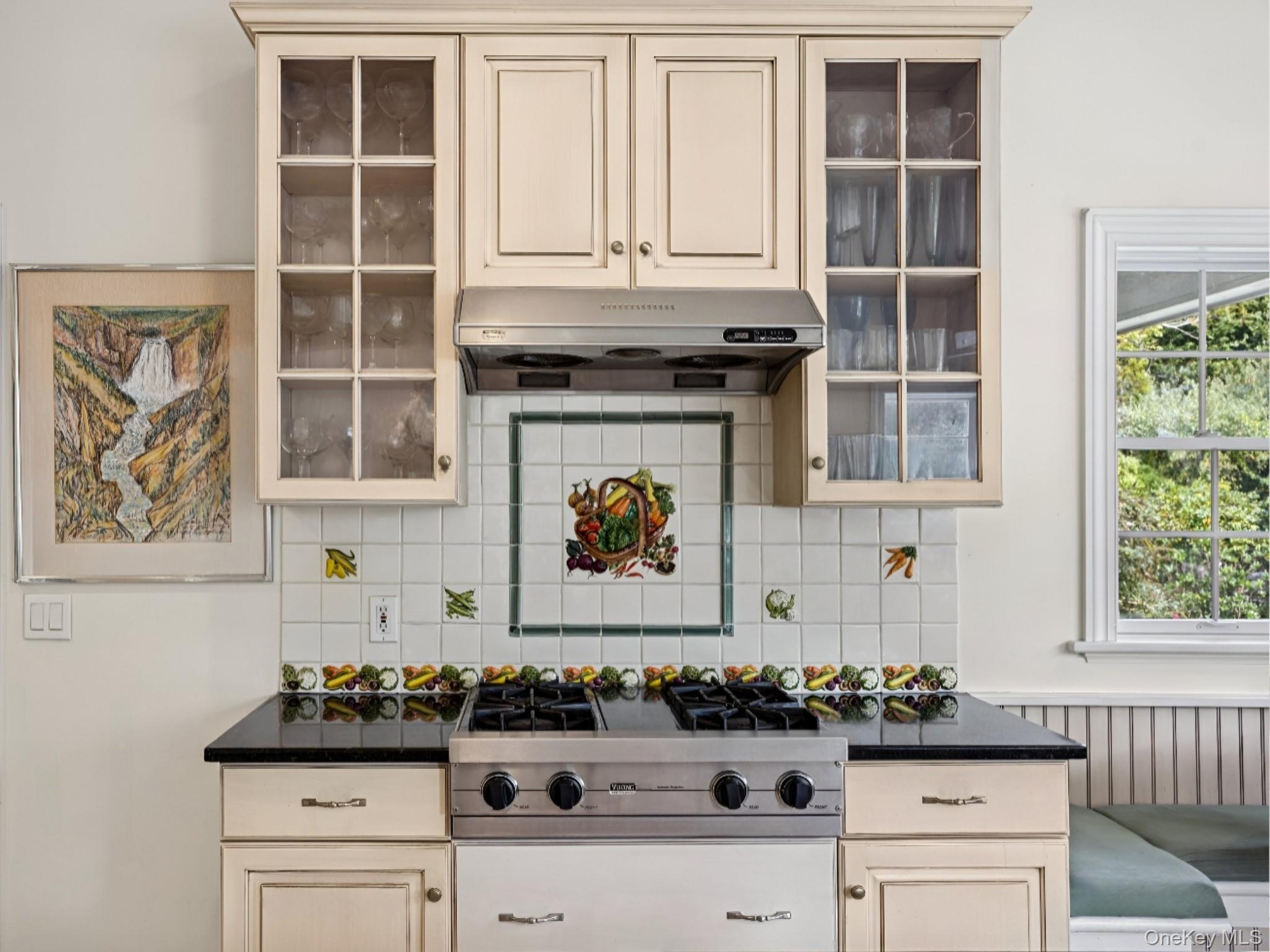 - A beautifully appointed kitchen adorned with granite countertops, a central island, custom cabinetry with glass inserts, and an inviting eat-in area.