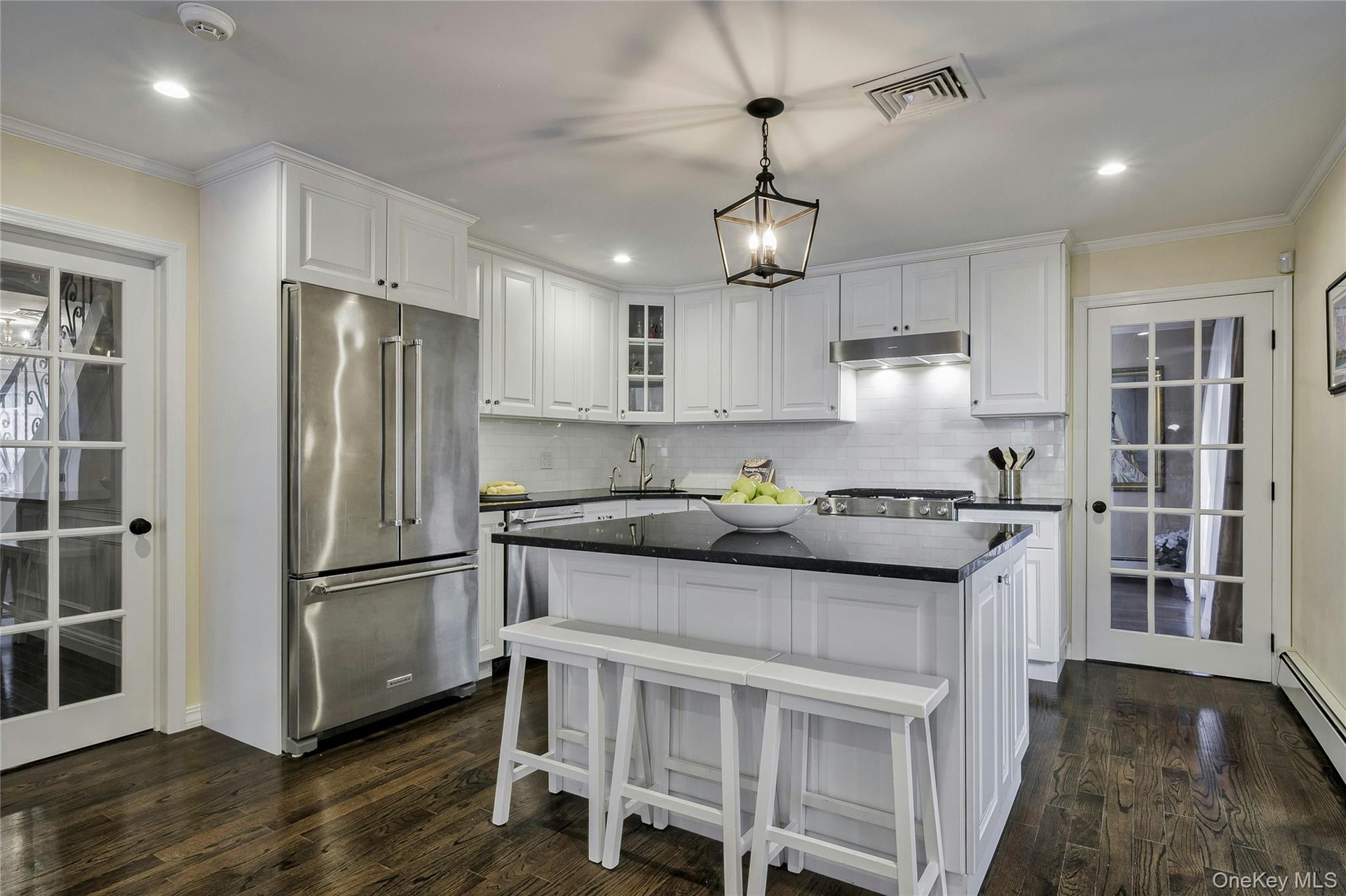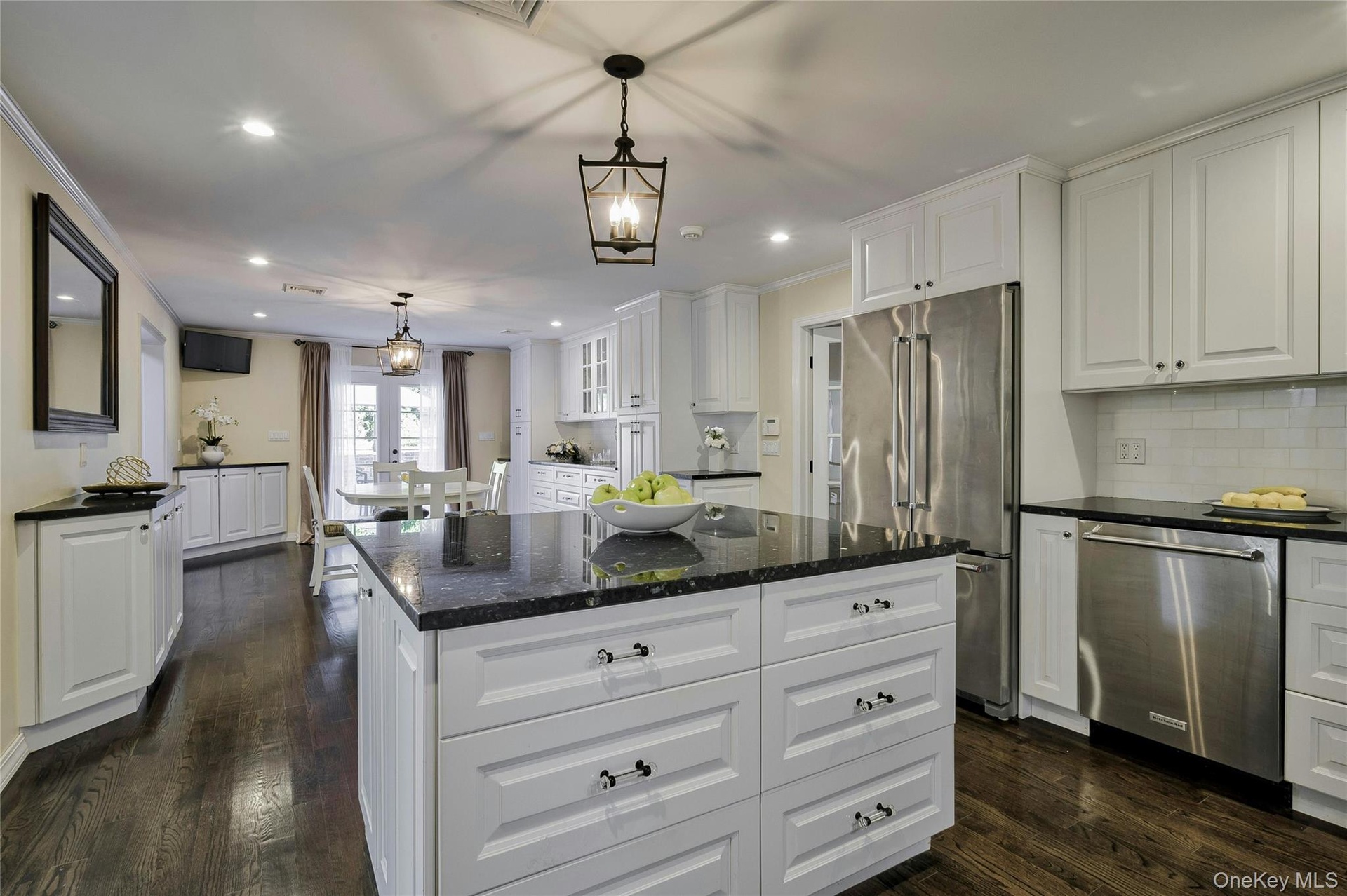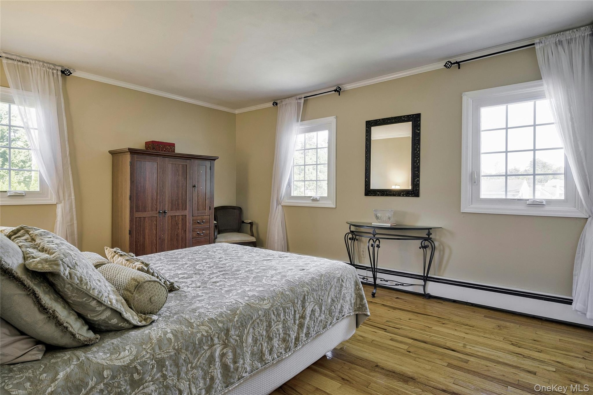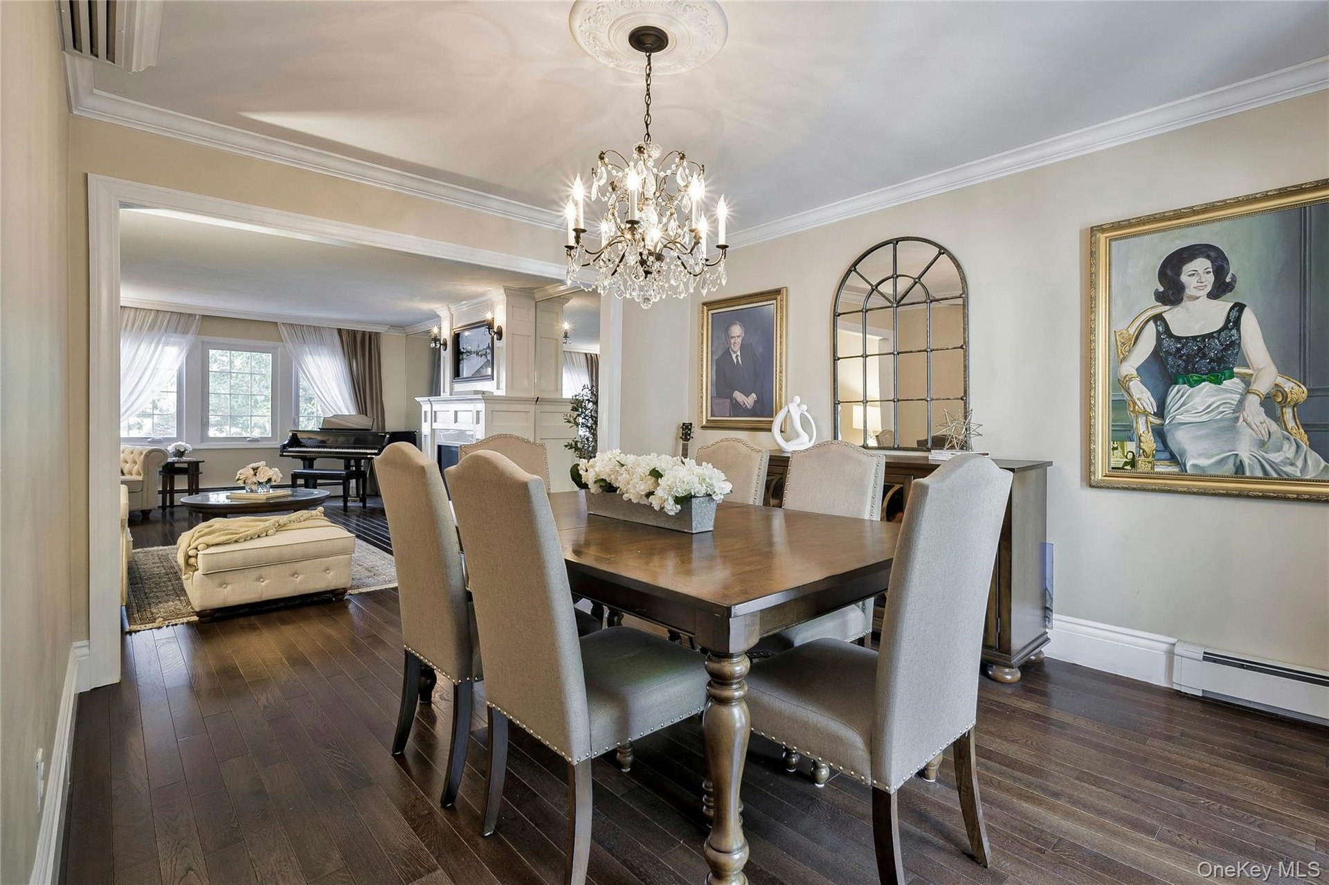 floors, moldings and wainscoting throughout, 6 bedrooms and 3.5 baths on a professionally landscaped lot in the heart of South Strathmore. A welcoming foyer leads to a formal living room with a gas fireplace, an elegant dining room, and a renovated kitchen with breakfast area. A bright, spacious family room/Custom Oak Den with fireplace, powder room, and first-floor guest suite complete the main level. Upstairs features a large primary suite, four additional bedrooms, one was extended less than ten years with high ceiling, and hallway bath. The finished basement includes outdoor access, ideal for recreation or entertaining. Renovated just 6 years ago, upgrades include a new kitchen, bathrooms, second-floor extension, patio, and driveway. Additional features: whole-house generator inlet, multi-zone sprinklers, and more. Low tax. Gas heating. CAC. Zoned for Munsey Park Elementary and Manhasset Secondary Schools, and close to the Americana Mall, restaurants, and public transport.