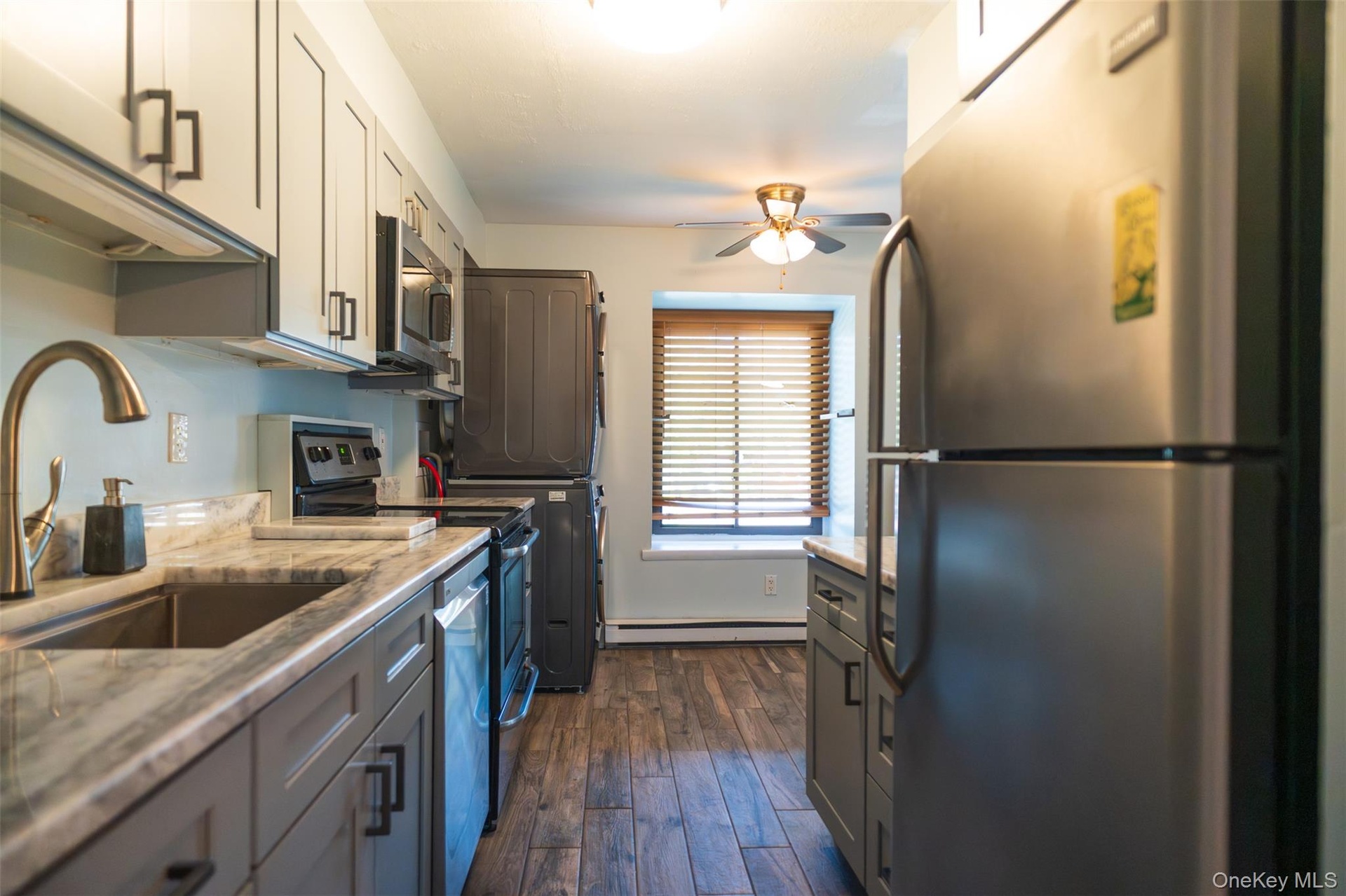 - Kitchen with gray cabinets, stainless steel appliances, a baseboard radiator, light wood-type flooring, and stacked washing machine and dryer