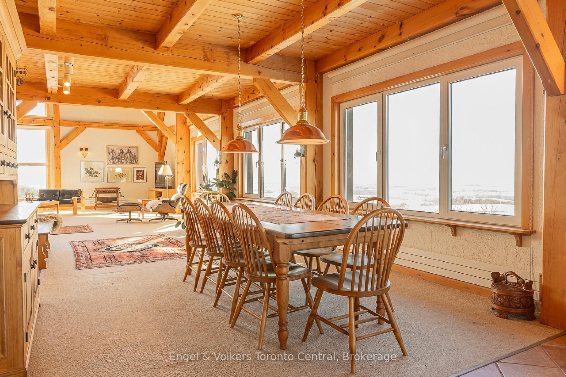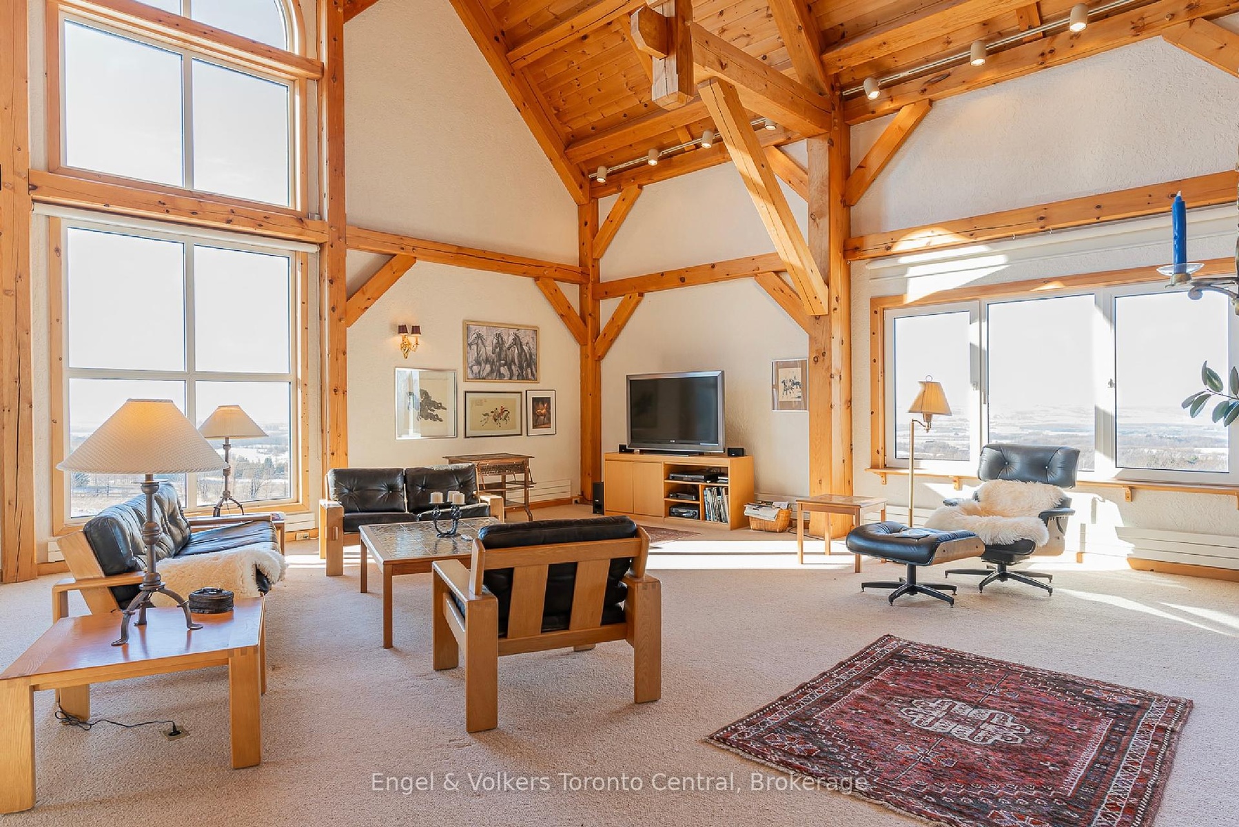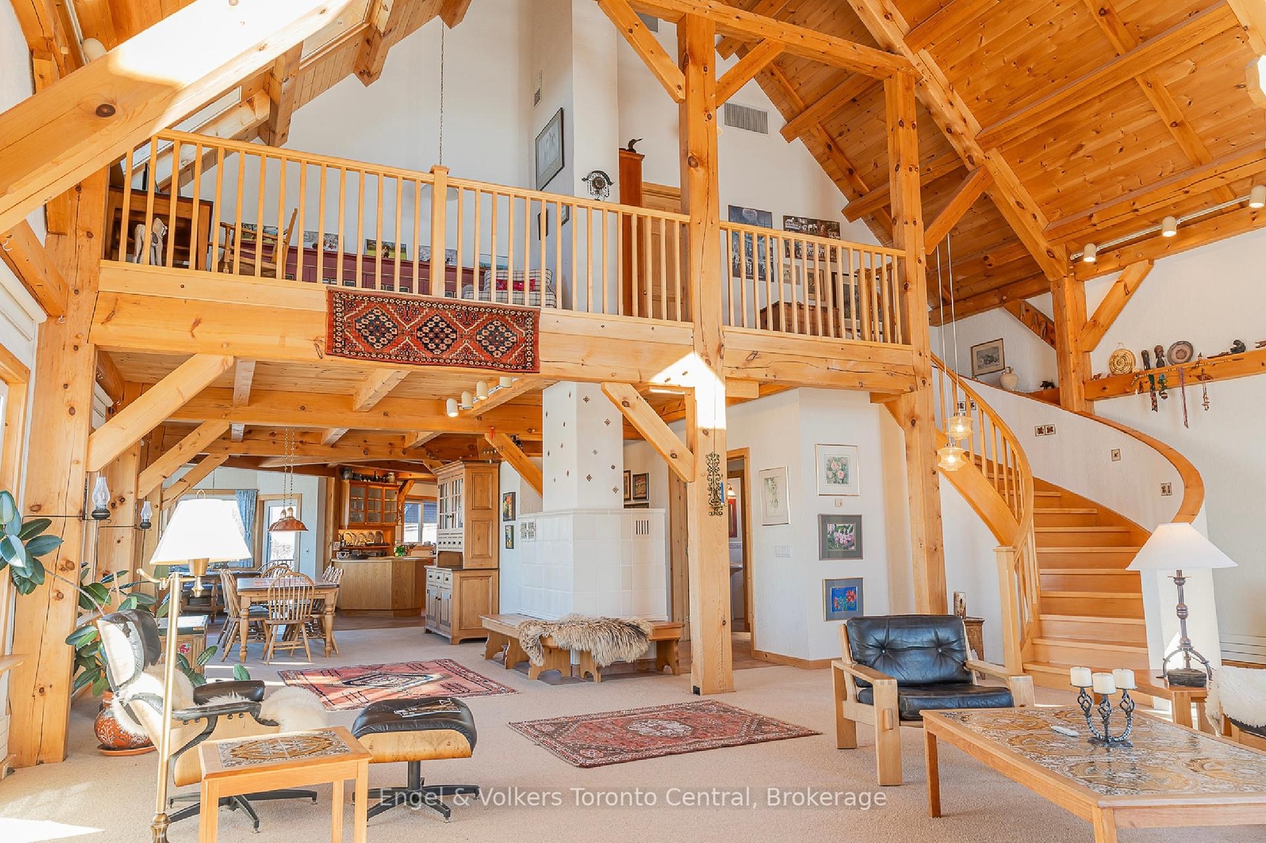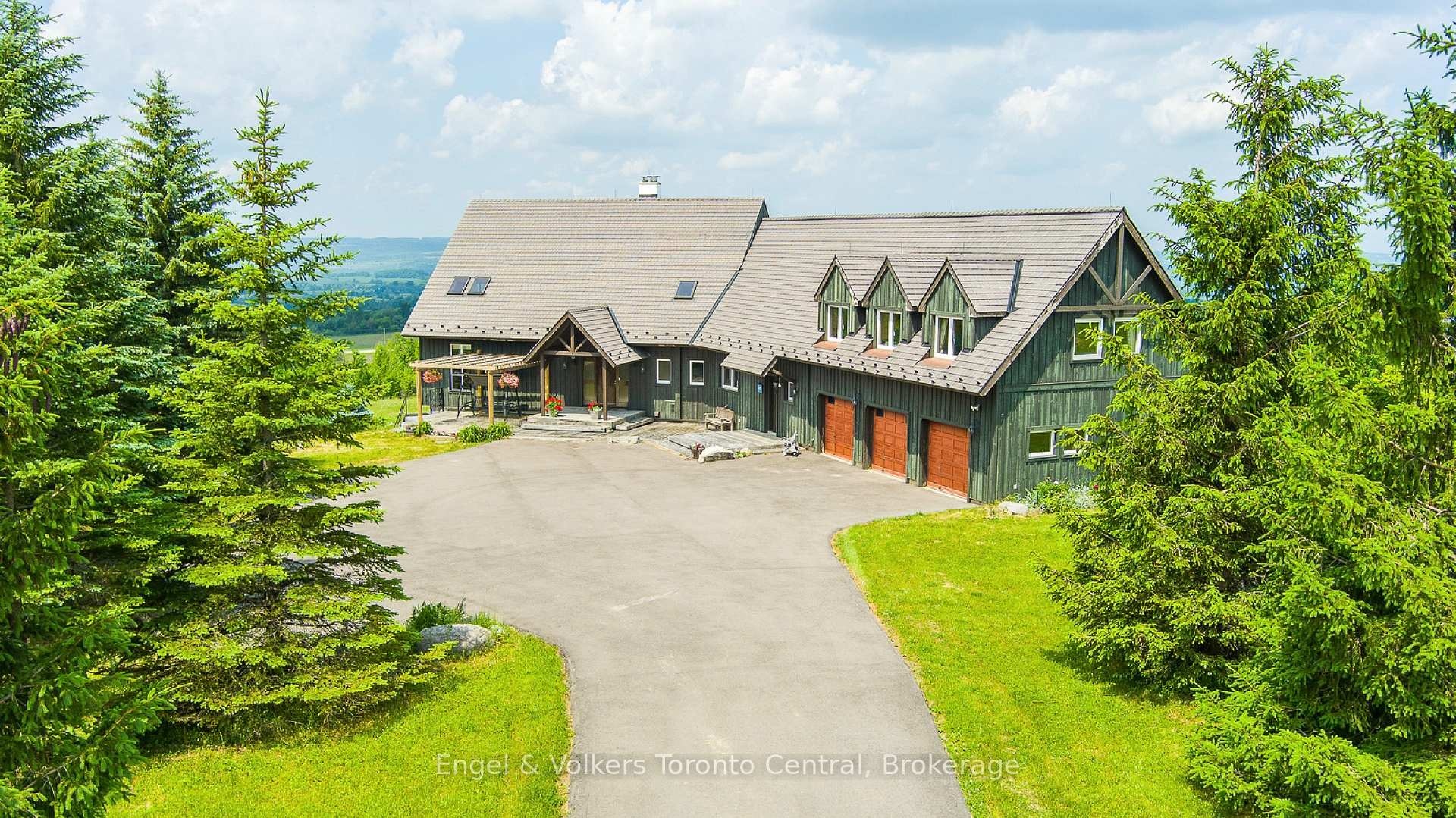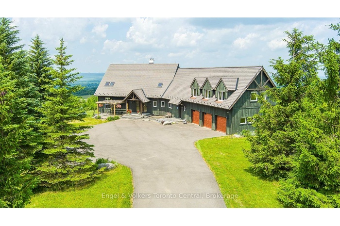 A Majestic Country Estate Overlooking Beaver Valley & Georgian Bay. Close your eyes and imagine waking up each morning to sweeping views of the Beaver Valley and the shimmering waters of Georgian Bay right from your own private 126-acre country estate. Designed and masterfully crafted by renowned architect Juergen Rust, this stunning post and beam masterpiece is perfectly positioned to capture the sunrise, sunset, and the ever-changing beauty of The Blue Mountains. A long, winding driveway leads to your hilltop retreat, a home that exudes warmth, craftsmanship, and timeless design. The open-concept main level offers generous living spaces, ideal for entertaining or quiet reflection, while each of the five bedrooms includes its own private ensuite bath, providing comfort and privacy for family and guests alike. The lower level is thoughtfully designed for independent living, perfect for extended family, visiting friends, or live-in support. Step outside and feel the serenity of country life. Ride horseback across rolling pastures, explore your own trails, or simply sip your morning coffee by the stable as the horses stir. There is ample space for a pond, pool, tennis court, or even a helipad, offering endless potential for recreation and luxury living.Conveniently located near the charming village of Thornbury, with its boutiques, restaurants, and scenic marina. This estate offers both peaceful seclusion and easy access to the regions four-season amenities from skiing and golf to hiking and boating.This is more than a home, it is a lifestyle. A rare opportunity to live in harmony with nature while surrounded by elegance, privacy, and breathtaking views that change with every season. Book a private viewing today and experience what few can truly imagine, life at the top of The Blue Mountains.