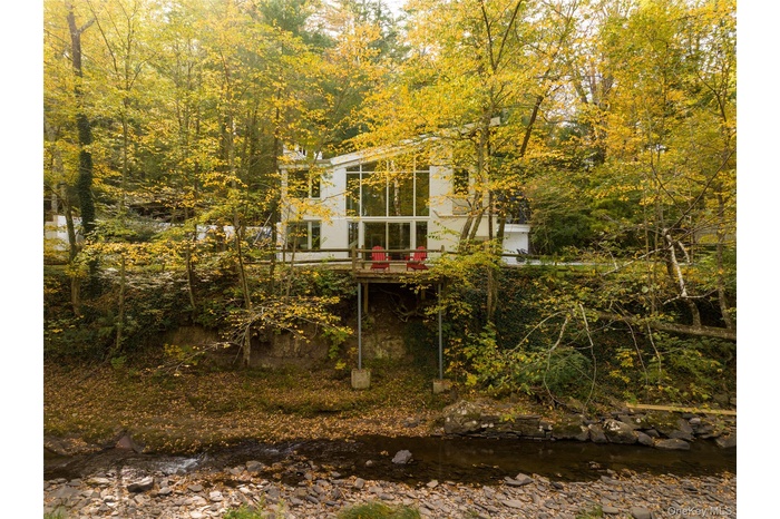 Every so often, a house comes along that feels less like real estate and more like a work of art, and this mid-century modern gem on Zena Road is exactly that. With its roots in the 1950’s (though the tax rolls say 1970), the home was designed by one of the last abstract expressionists, and it shows: glass, stone, and iron frame a structure that feels both timeless and deeply of its era. The home features a rare "hypar" (hyperbolic paraboloid) roof, which is known for its distinctive curvature. Perched above the Sawkill Creek with nearly 300 feet of frontage, the creek becomes an integral part of every view and every room. Living here means living inside a moving landscape. From every angle, the home’s high perch captures a rare perspective: a sweeping vista where water and woods become one.