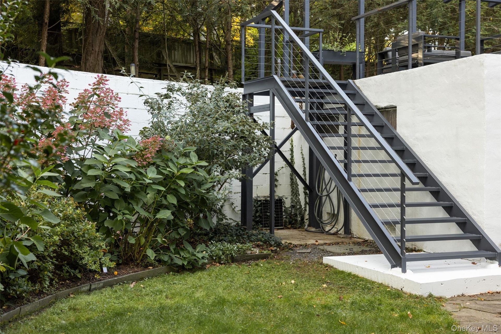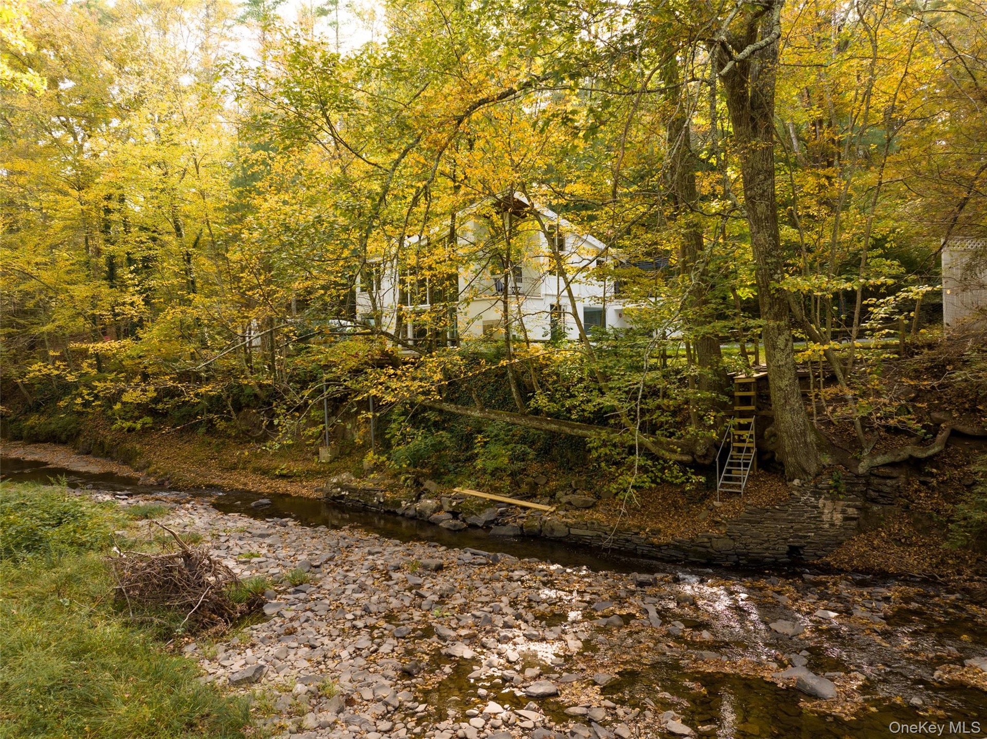 Step past the mature landscaping and discover a series of decks, balconies, and seating areas that offer distinct experiences with the forest and creek. Just outside the sliding glass doors, a stone patio hugs the side of the home, an ideal setting for grilling or enjoying meals outdoors. A spacious wooden deck stretches out over the water, offering a serene spot to take in the creek views. Nearby, a built-in ladder provides easy access down to the water for swimming and cooling off on warm days. Further up the lawn, Adirondack chairs circle a cozy firepit, perfect for relaxing under the stars.