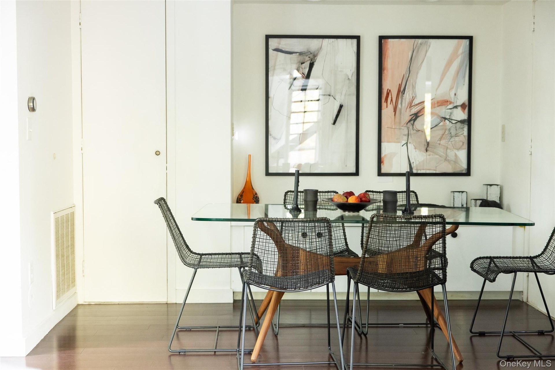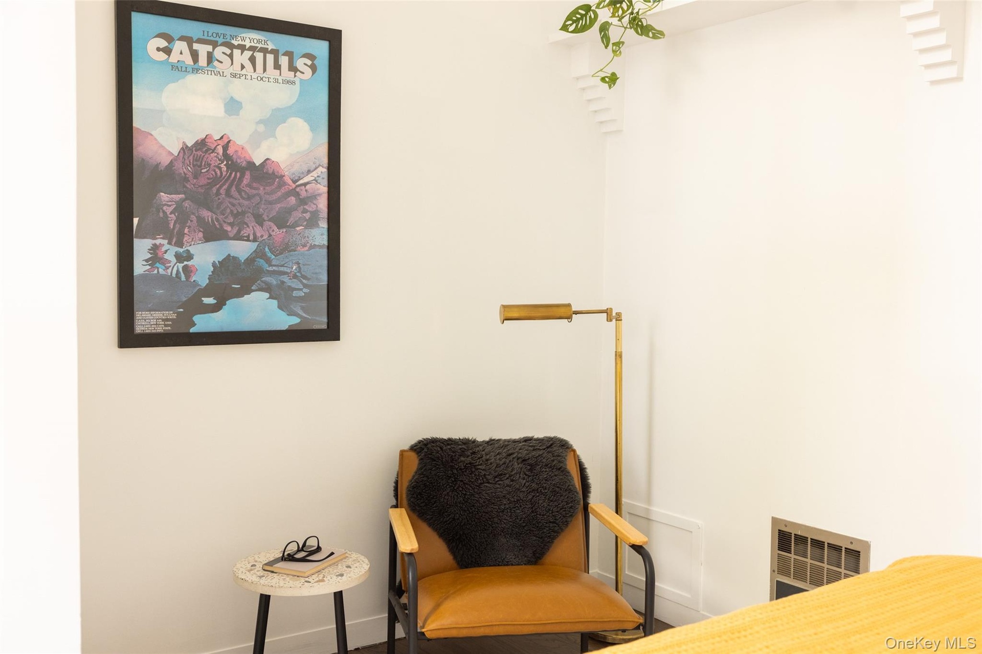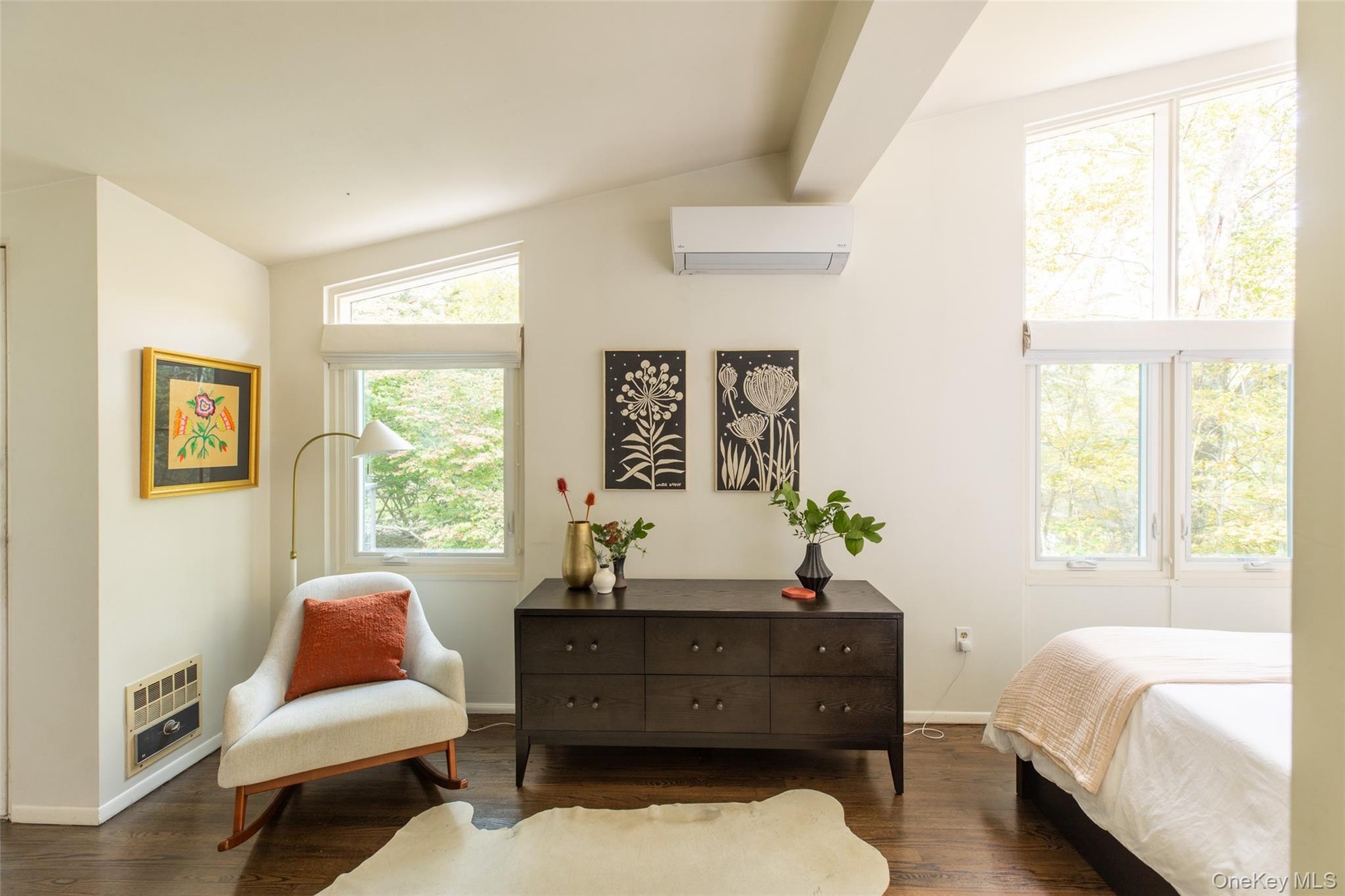 - Sitting room with dark wood-type flooring and a wall mounted AC