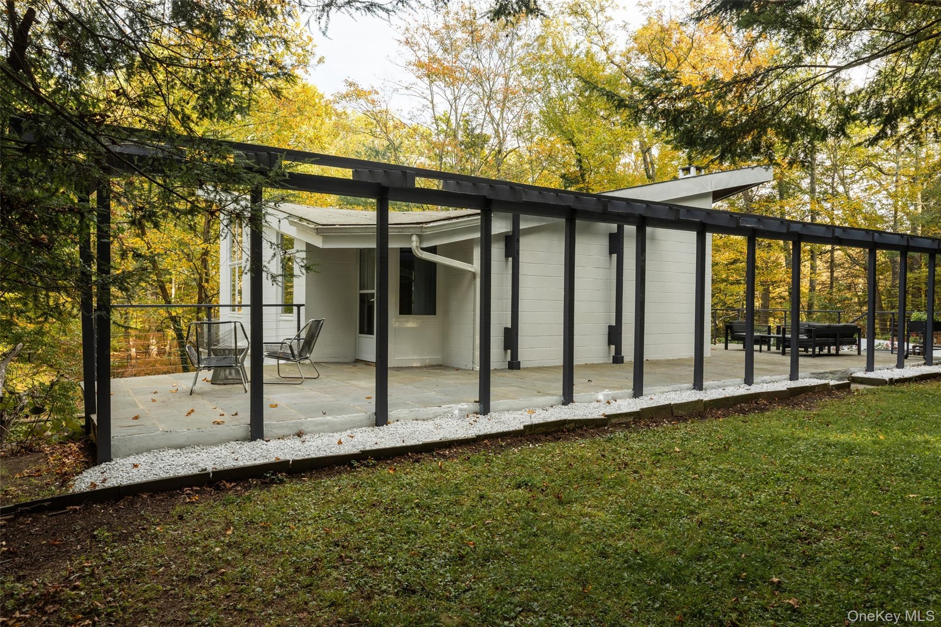 - View of community featuring a patio, a pergola, outdoor lounge area, and a yard