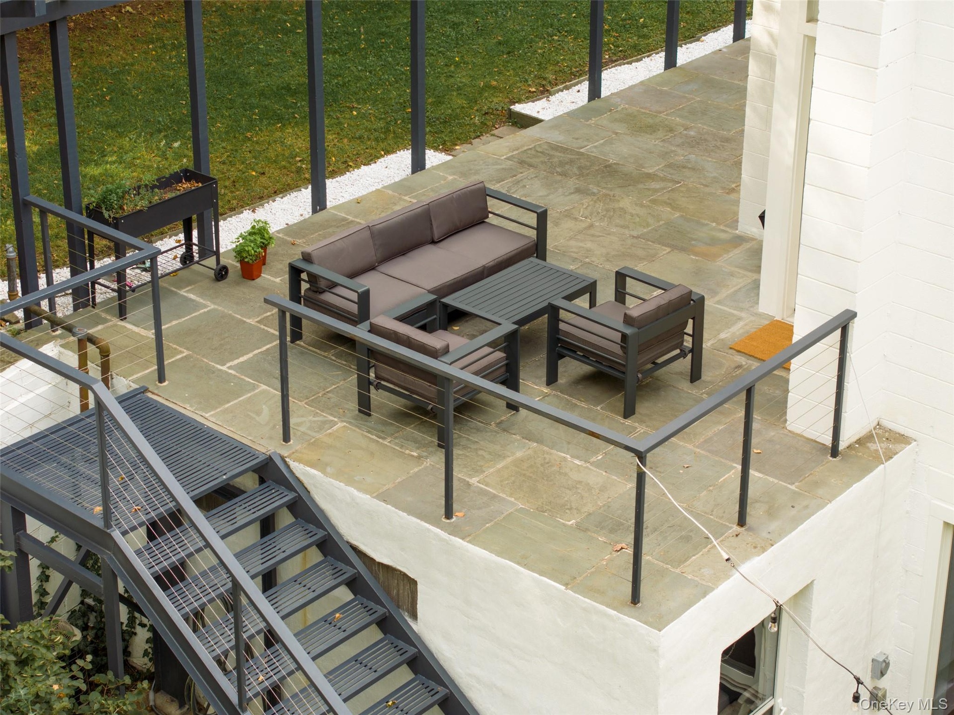 The generously sized primary suite features a renovated bathroom and a private exit to the upper deck, marked with stylish brise-soleil. It also features a juliet balcony for a morning coffee or meditation. The second bedroom has its own private exit to the deck, allowing all occupants of the dwelling to enjoy proximity to the natural landscape. The second floor also features a fully renovated bathroom with an oversized standing shower.