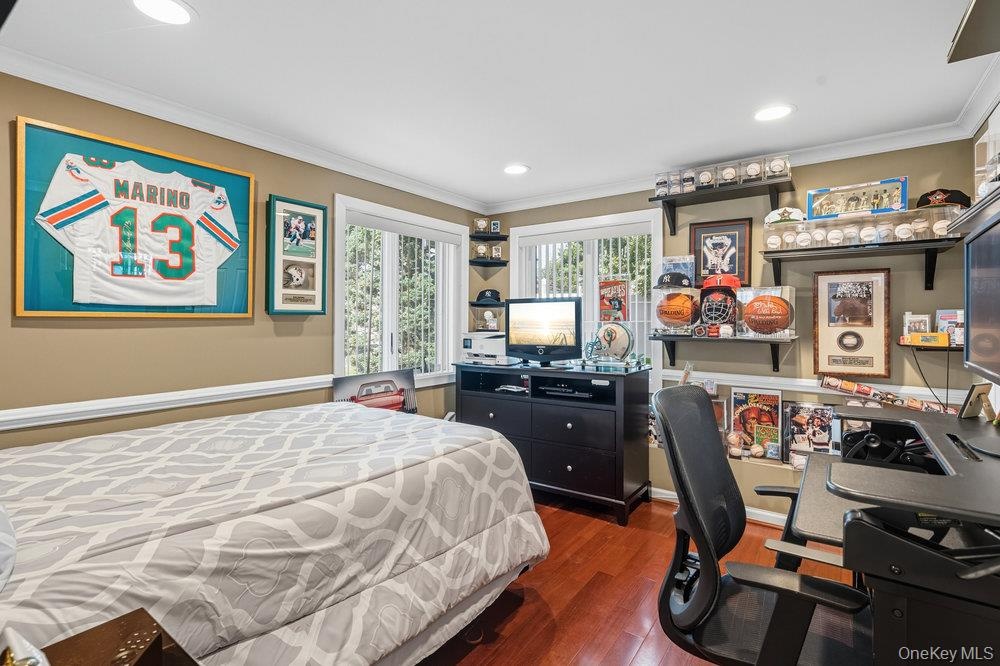 - Bedroom featuring dark wood finished floors, ornamental molding, recessed lighting, and a desk