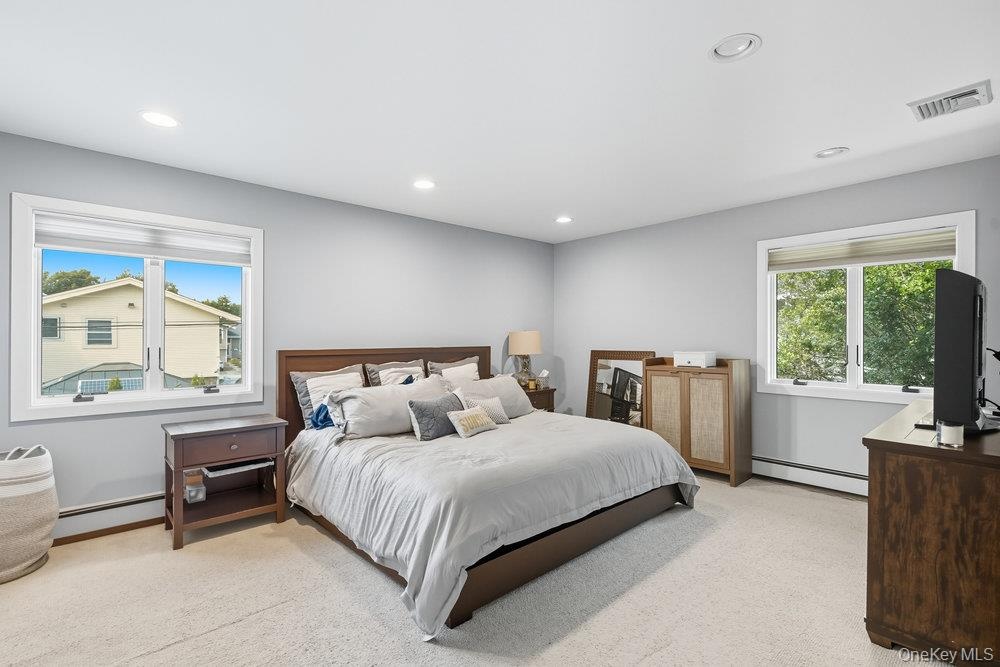 - Bedroom with light colored carpet, a baseboard radiator, and recessed lighting