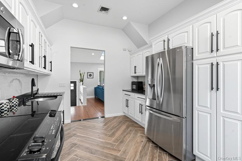 - Kitchen featuring stainless steel appliances, vaulted ceiling, white cabinetry, recessed lighting, and decorative backsplash