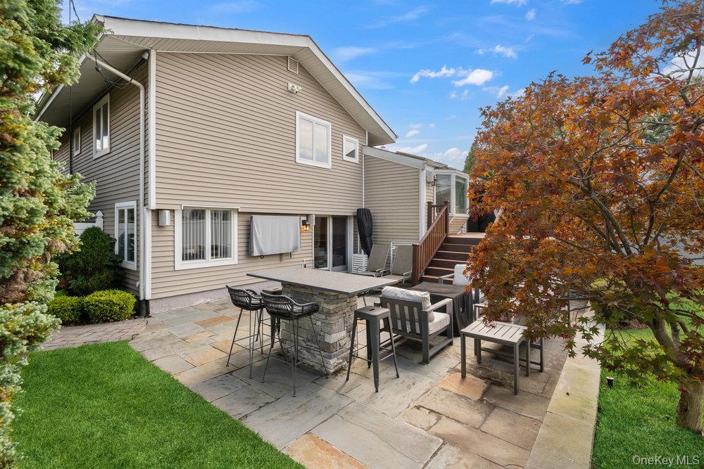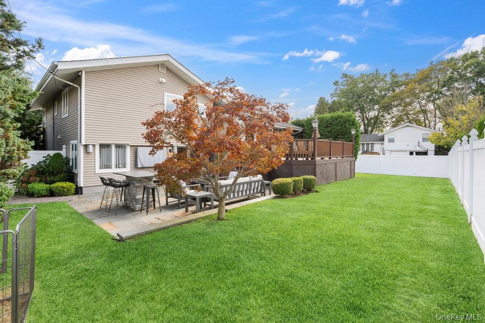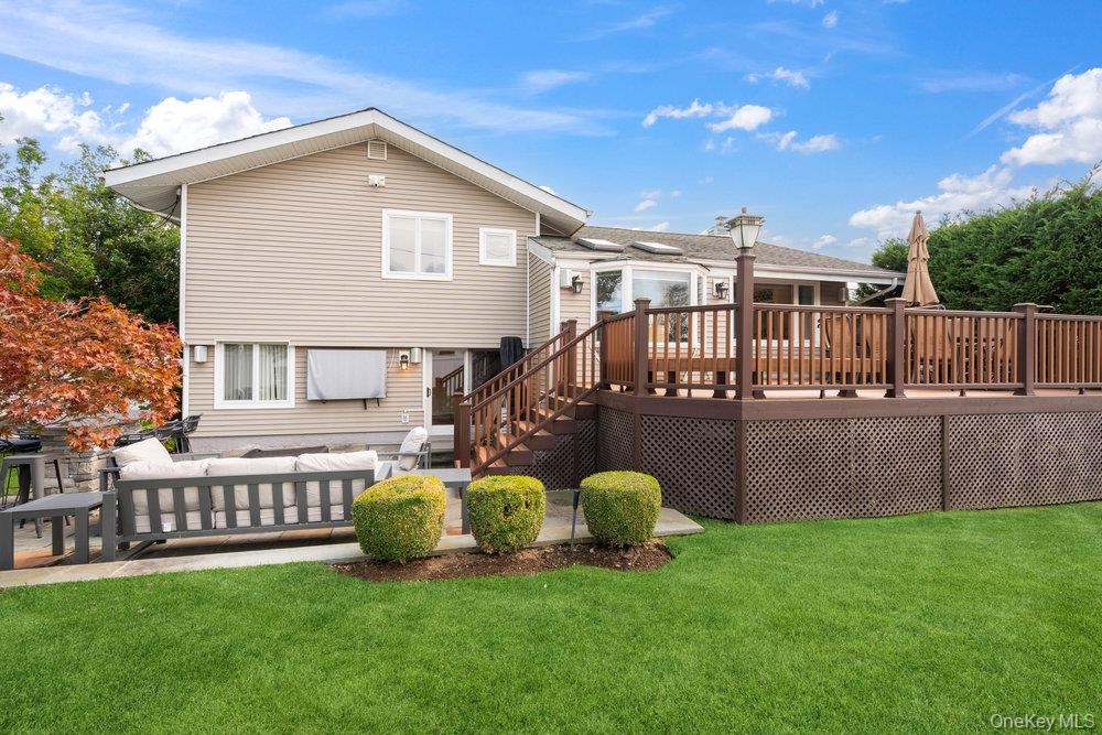 Outdoor living is truly exceptional with an amazing multi-level backyard designed for entertaining, featuring a bluestone patio, new Trex deck, and wiring for outdoor music and entertainment—perfect for hosting gatherings or relaxing in style.