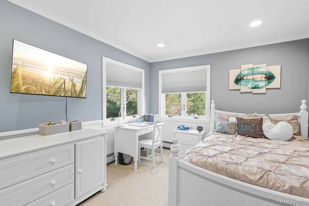 - Bedroom featuring a desk, light carpet, ornamental molding, recessed lighting, and a baseboard heating unit