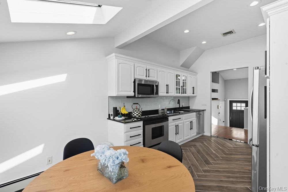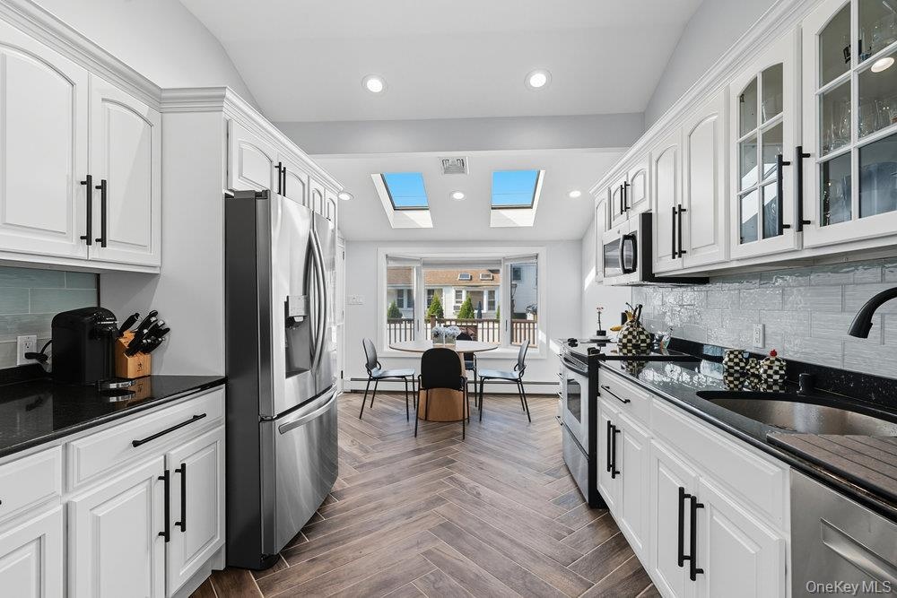 - Kitchen featuring lofted ceiling, decorative backsplash, a skylight, white cabinets, and stainless steel appliances