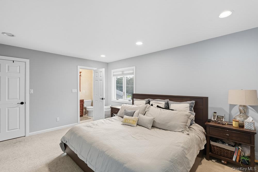 - Bedroom featuring light colored carpet, recessed lighting, and ensuite bathroom