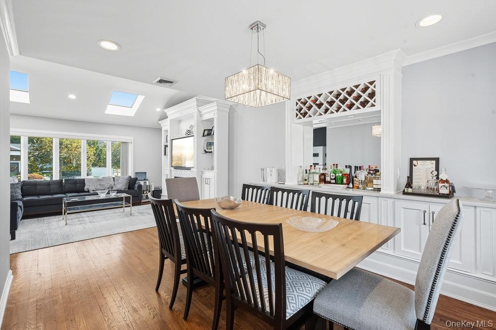 - Dining space featuring recessed lighting, a chandelier, hardwood / wood-style floors, and a bar