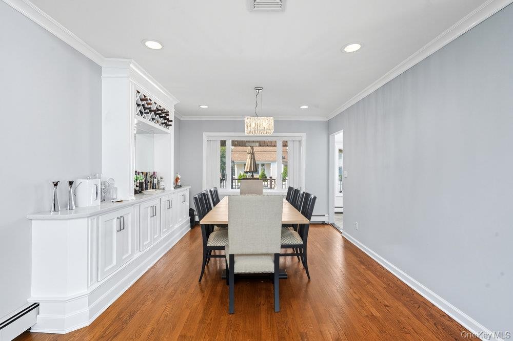 - Dining area featuring ornamental molding, wood finished floors, recessed lighting, a baseboard radiator, and a chandelier