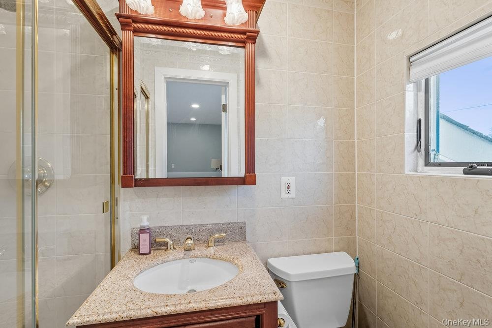 - Full bathroom featuring tile walls, vanity, and a stall shower