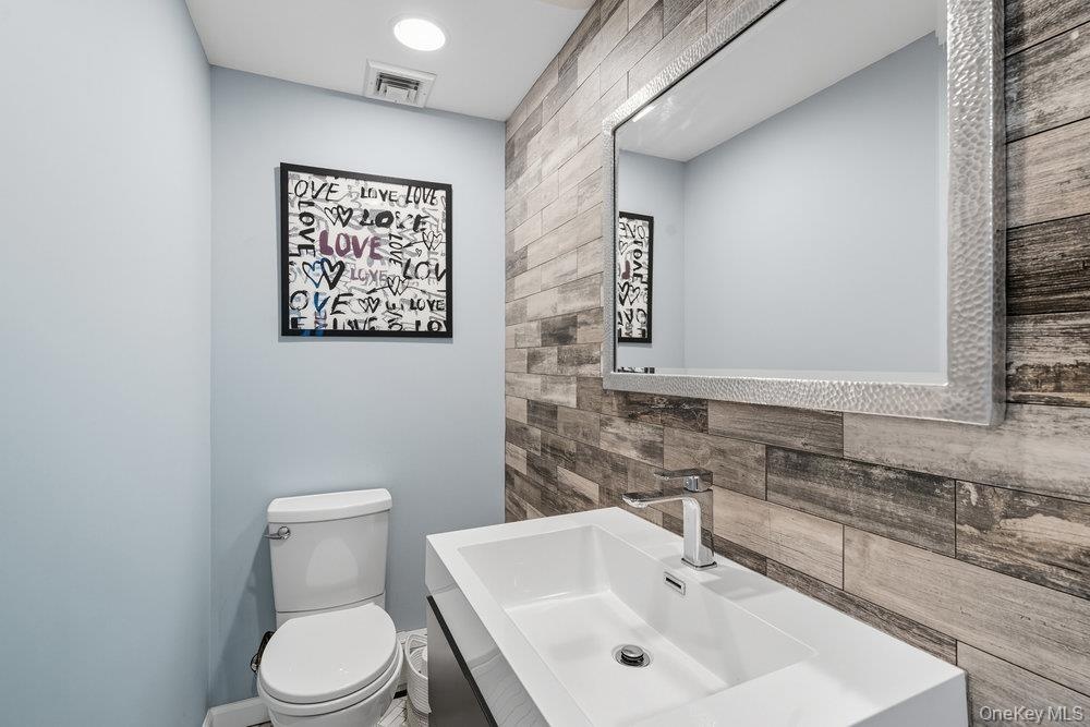 - Bathroom with vanity, decorative backsplash, and tile walls