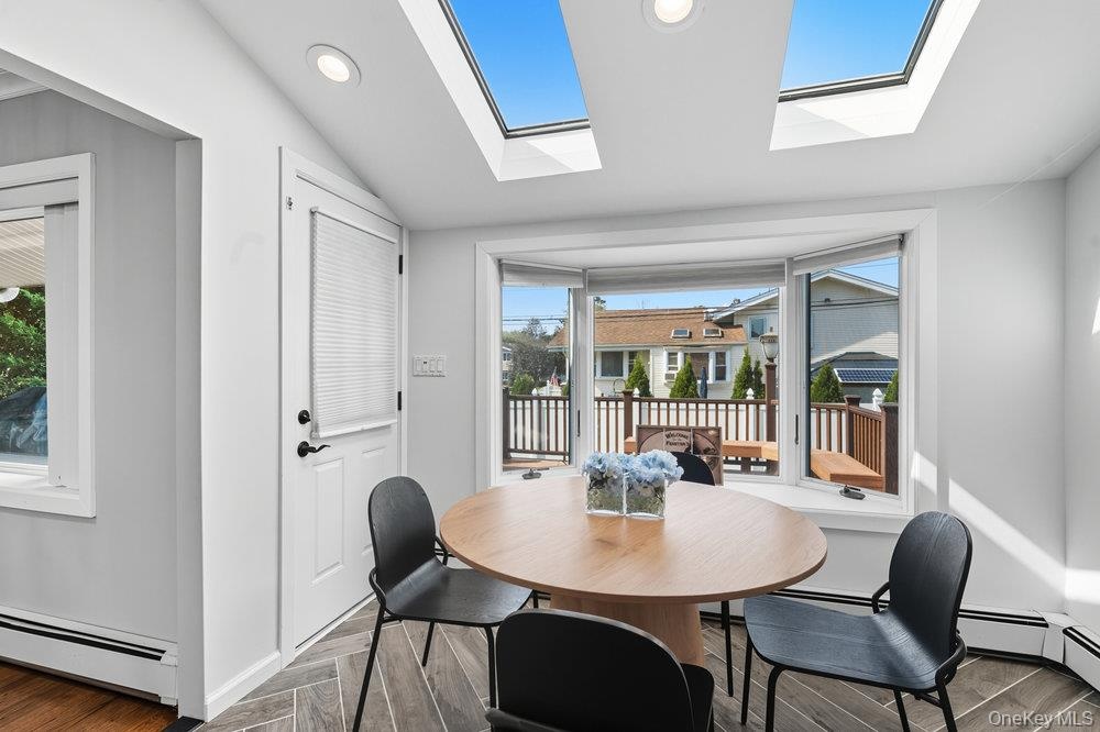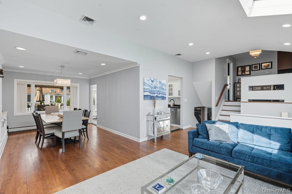 - Living room with wood finished floors, a skylight, recessed lighting, a glass covered fireplace, and baseboard heating