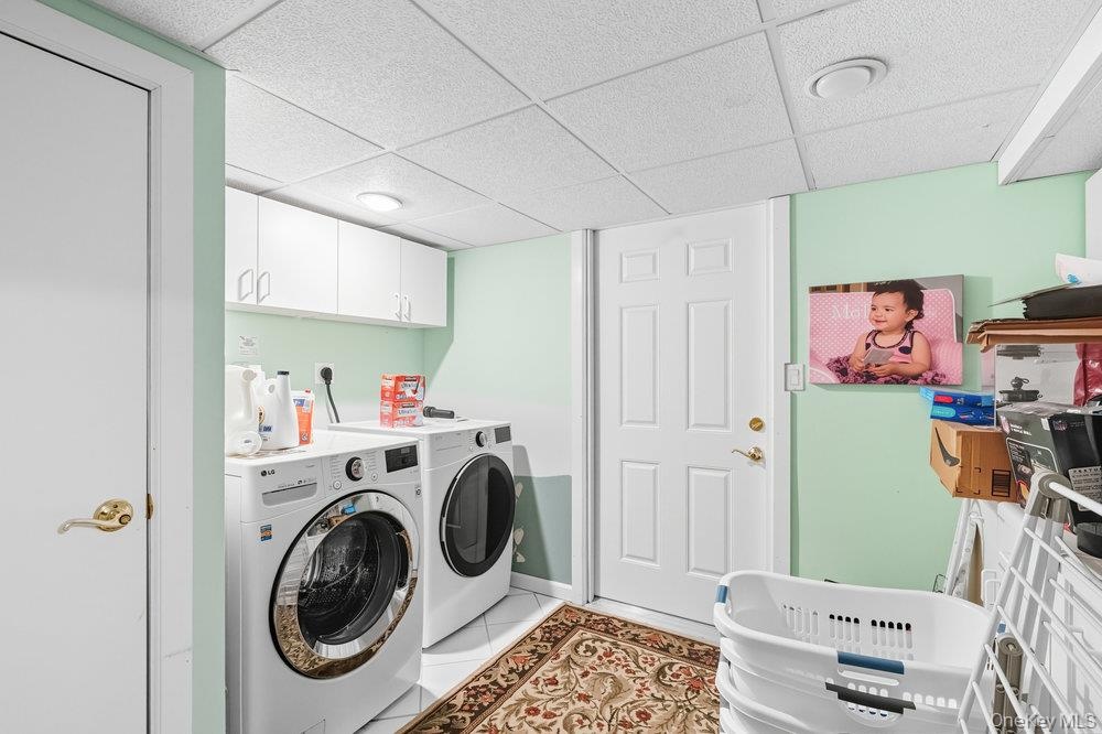 - Laundry room with a drop ceiling, independent washer and dryer, light tile patterned floors, and cabinet space