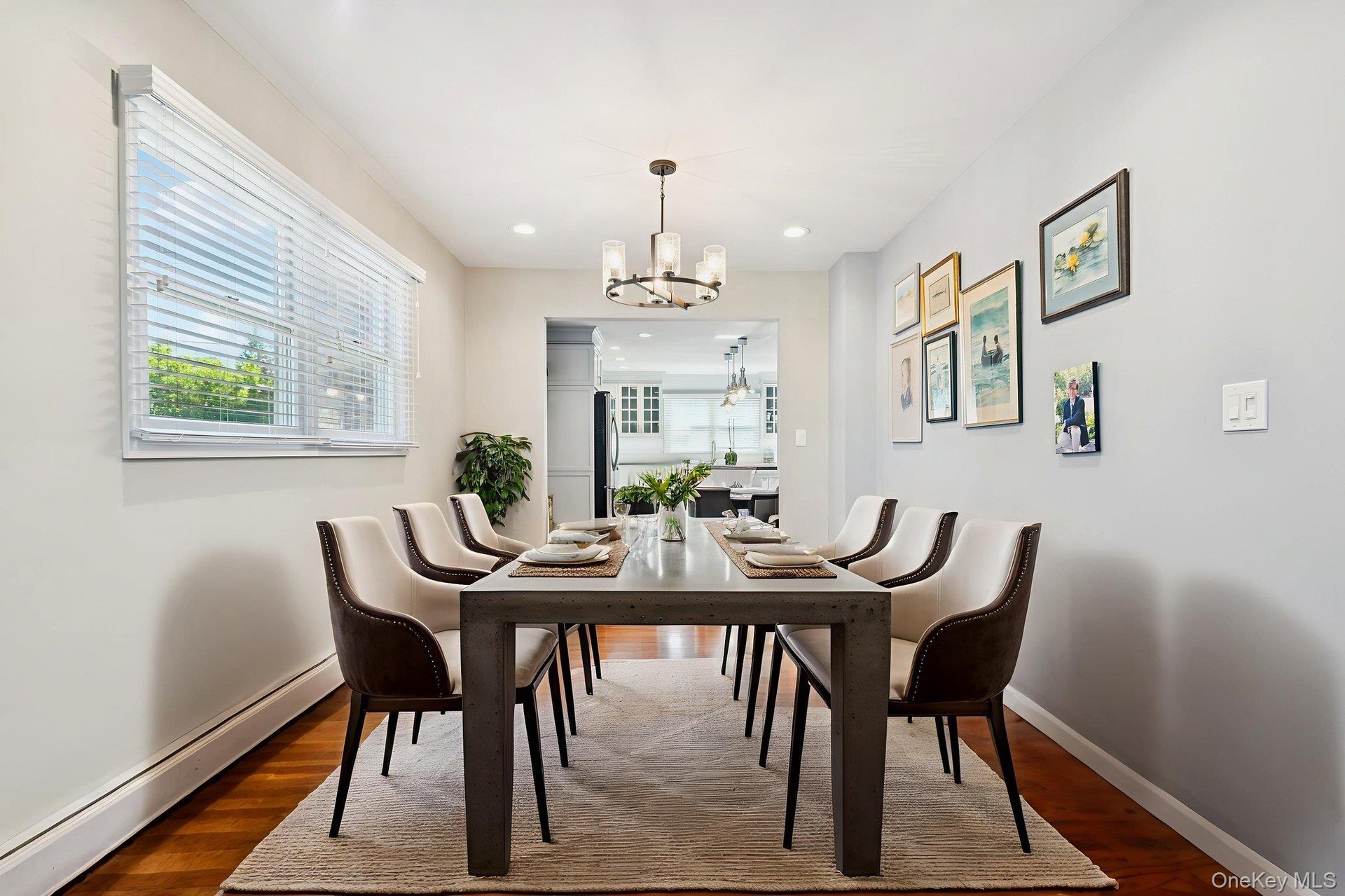 - Dining area with baseboard heating, dark wood-style flooring, a chandelier, and recessed lighting