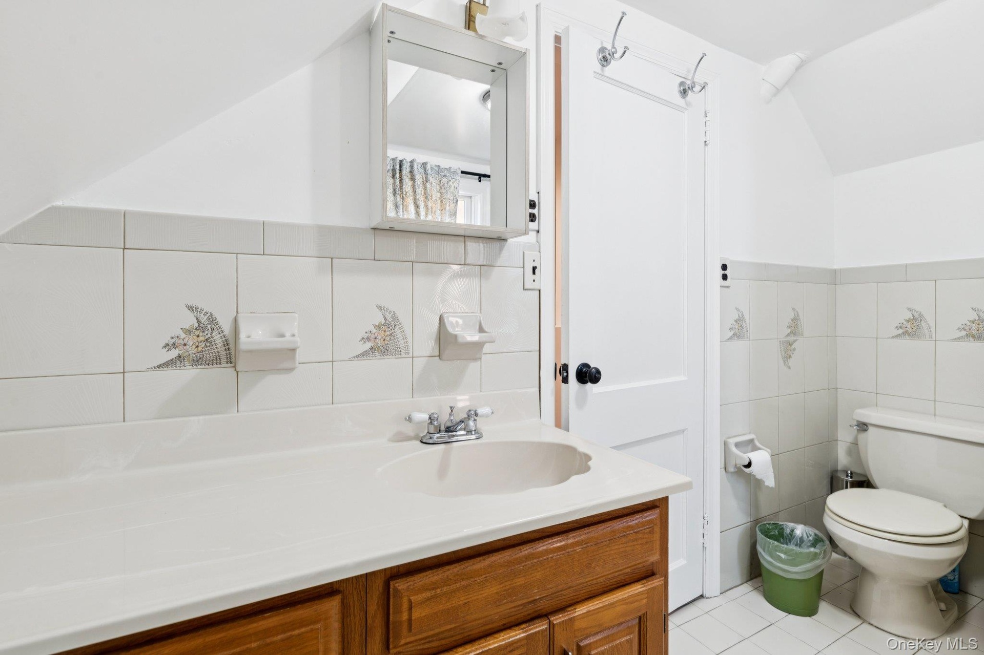 - Bathroom with tile walls, vanity, and light tile patterned floors