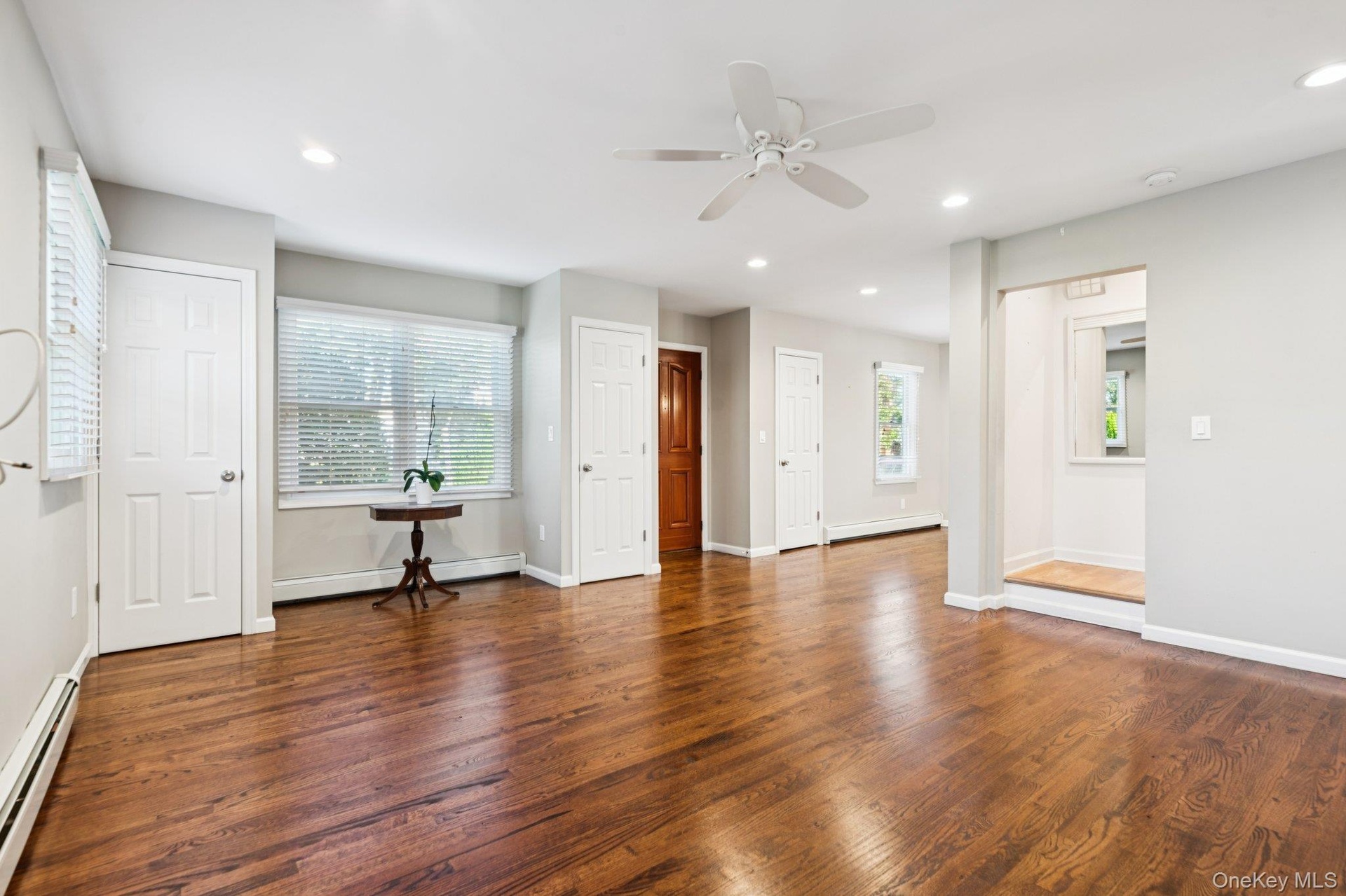 - Living room with wood finished floors, recessed lighting, a ceiling fan, and a baseboard radiator