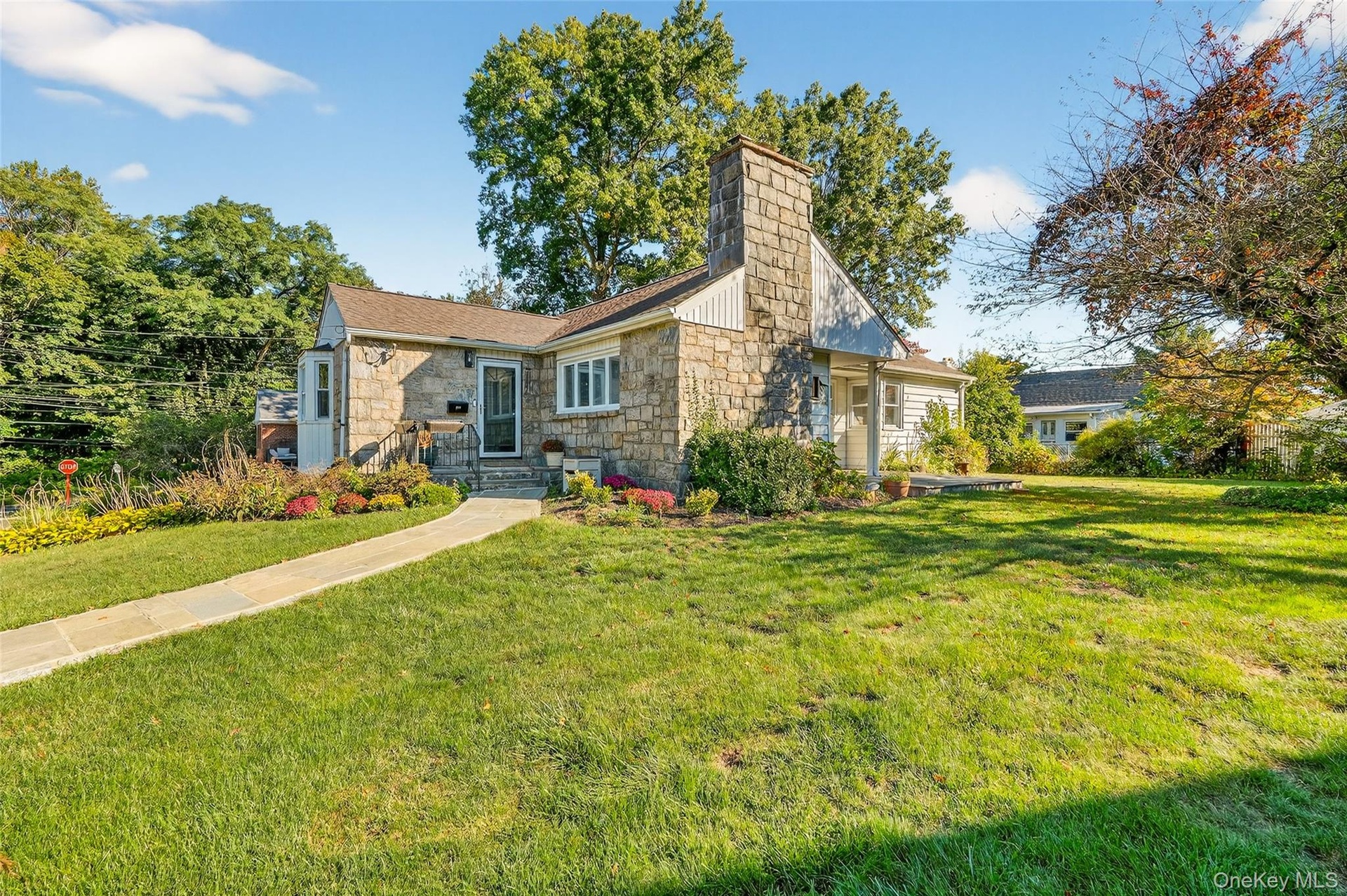 - View of front facade featuring a front lawn, stone siding, and a chimney