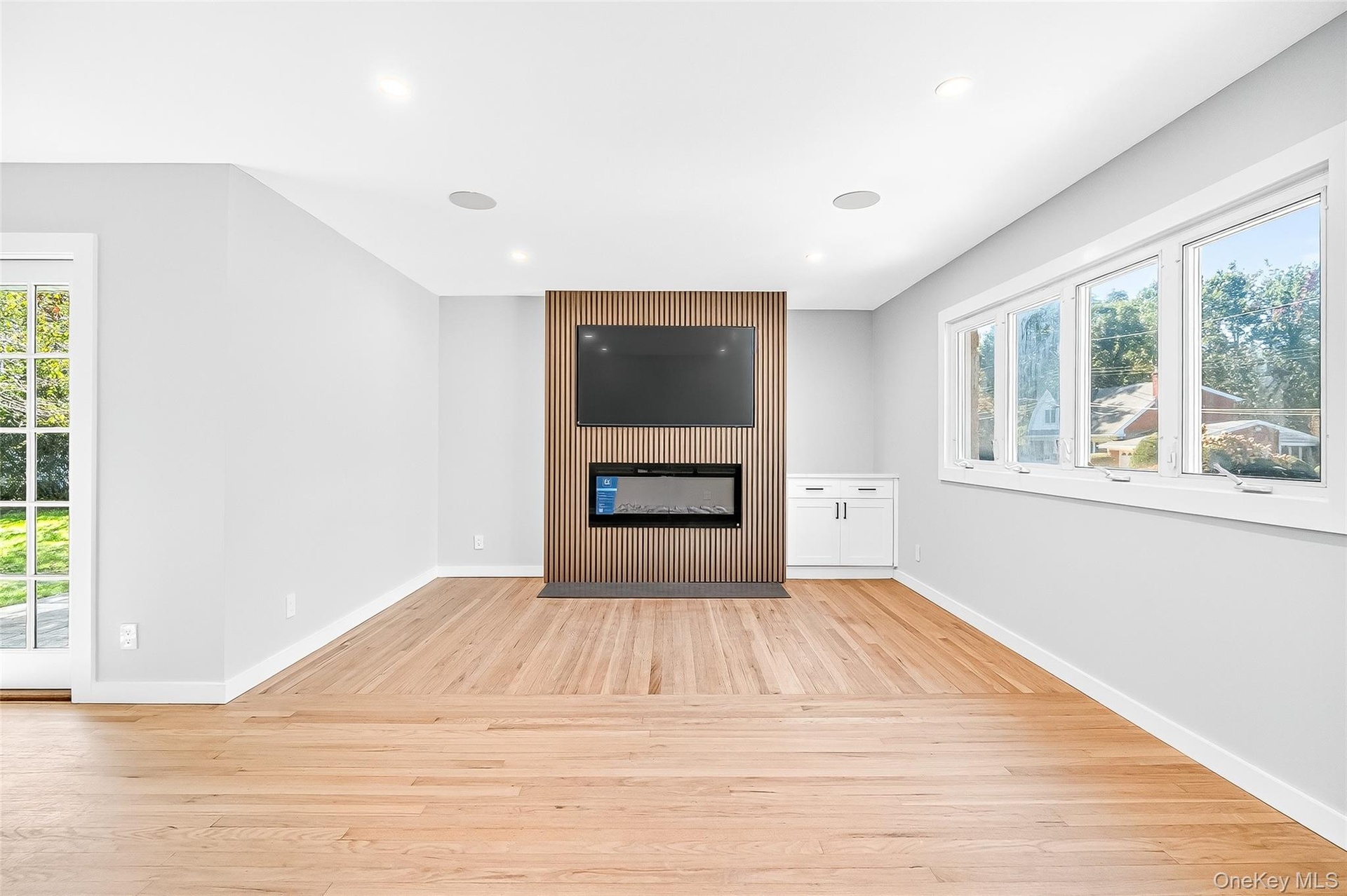 - Unfurnished living room featuring a fireplace, light wood finished floors, and recessed lighting