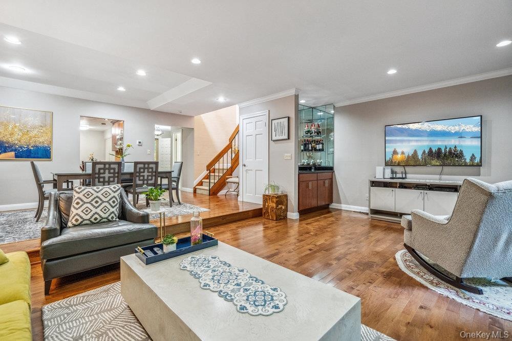 - Living area featuring wood finished floors, recessed lighting, stairway, crown molding, and a bar
