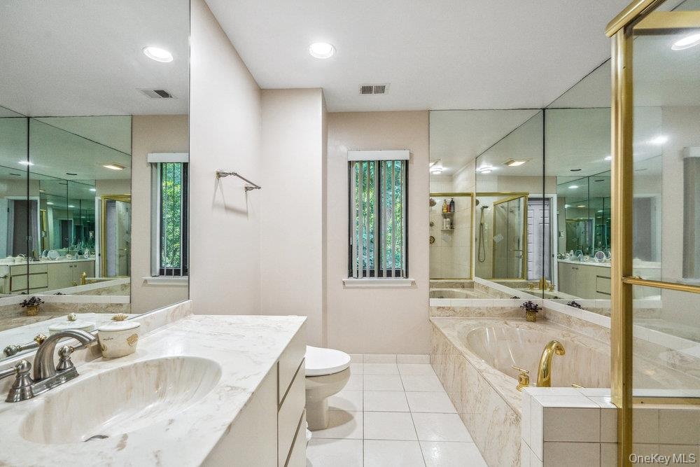 - Full bath with a garden tub, vanity, a shower stall, light tile patterned floors, and recessed lighting