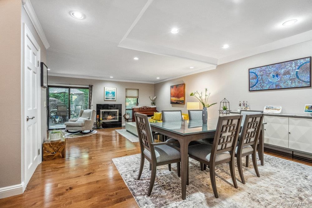 - Dining space featuring light wood-type flooring, recessed lighting, a glass covered fireplace, and crown molding