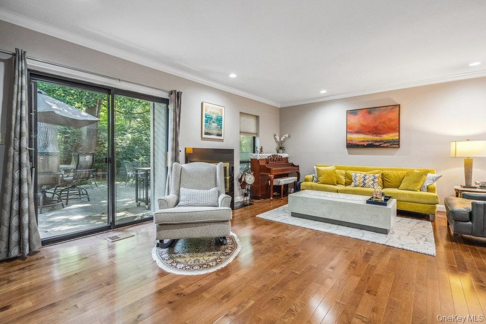 - Living area with ornamental molding, wood-type flooring, and recessed lighting