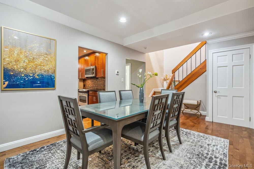 - Dining area featuring wood finished floors, stairway, and recessed lighting