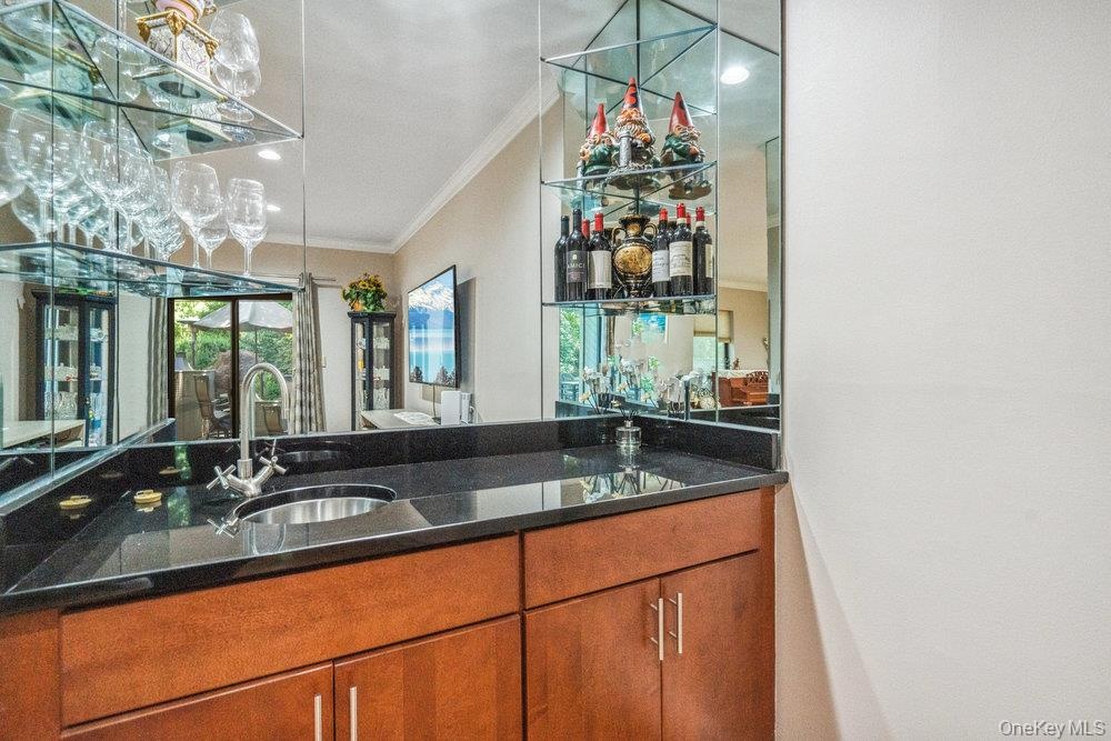 - Indoor wet bar featuring brown cabinetry, ornamental molding, dark stone counters, and recessed lighting