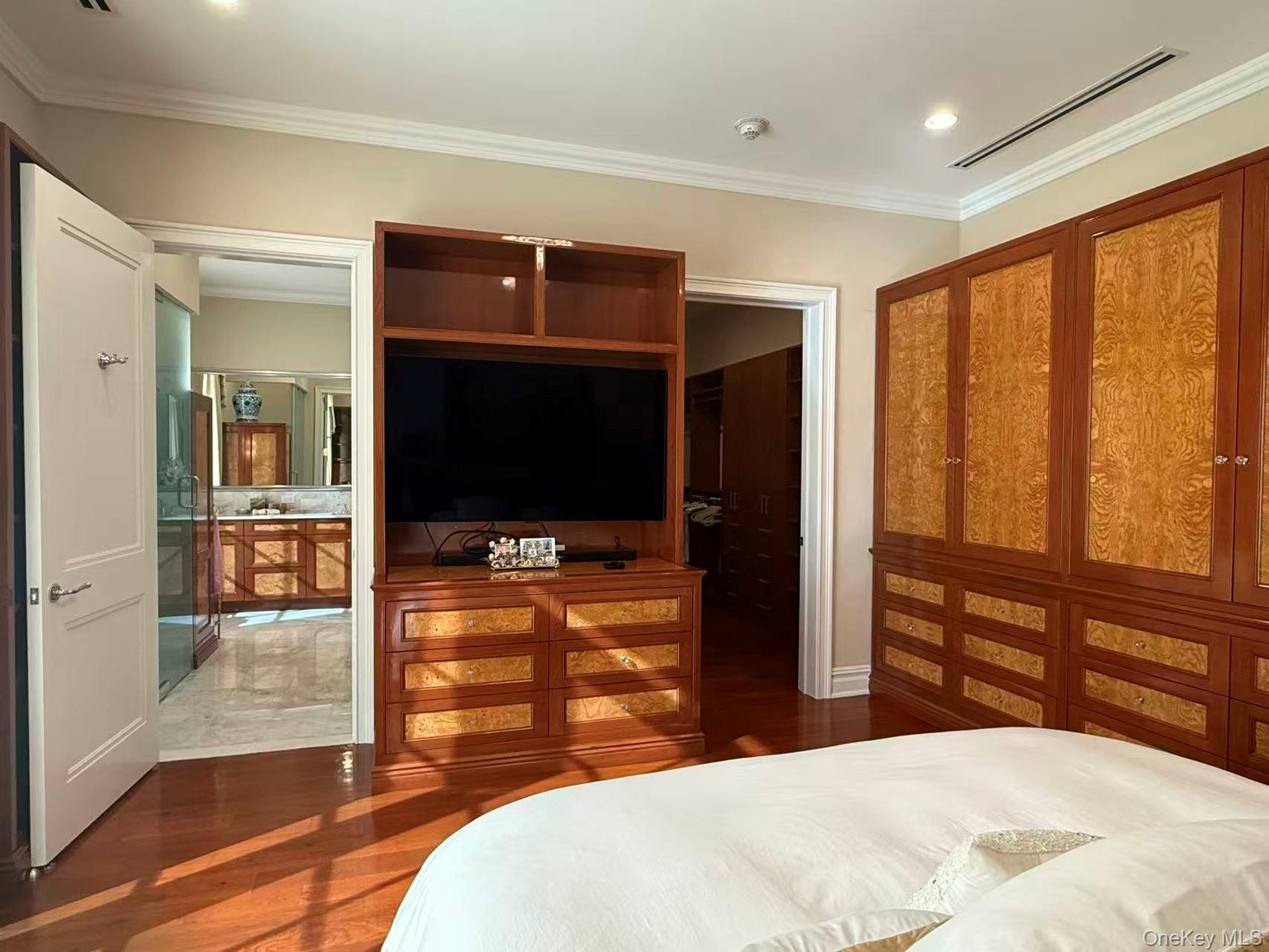 - Bedroom featuring ornamental molding, dark wood-type flooring, recessed lighting, and connected bathroom