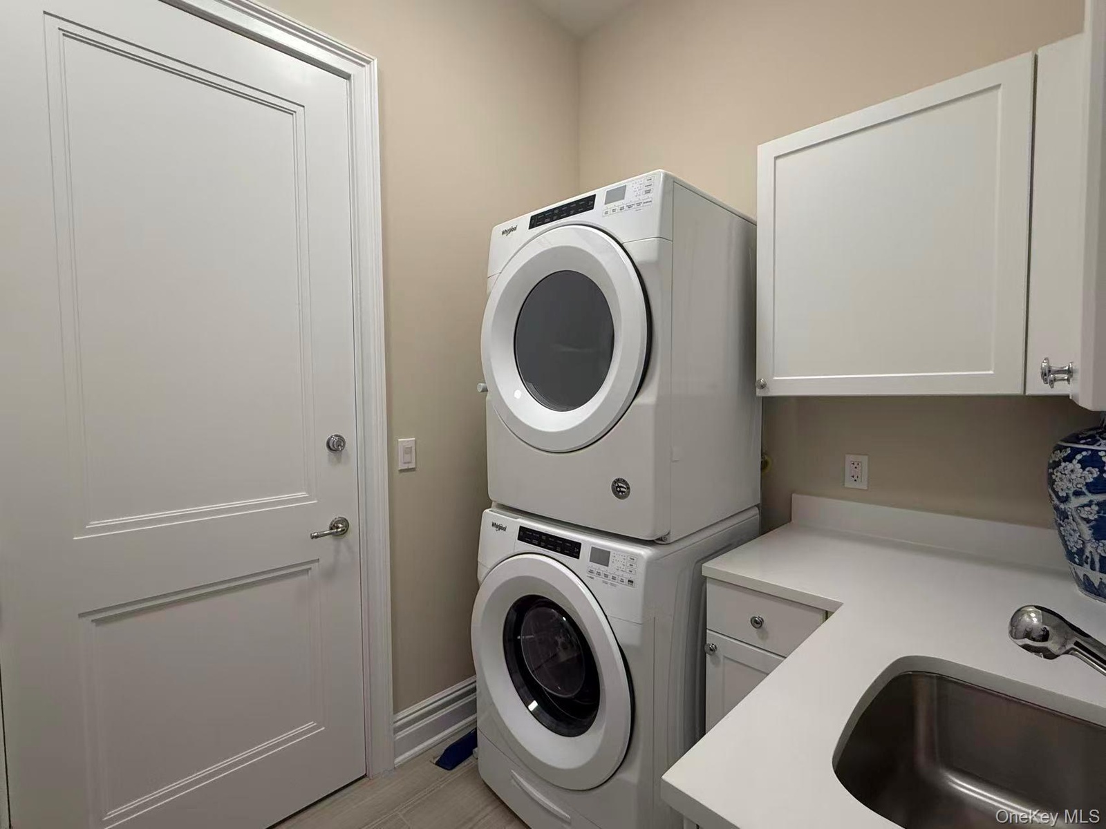 - Laundry area featuring stacked washing machine and dryer and a sink