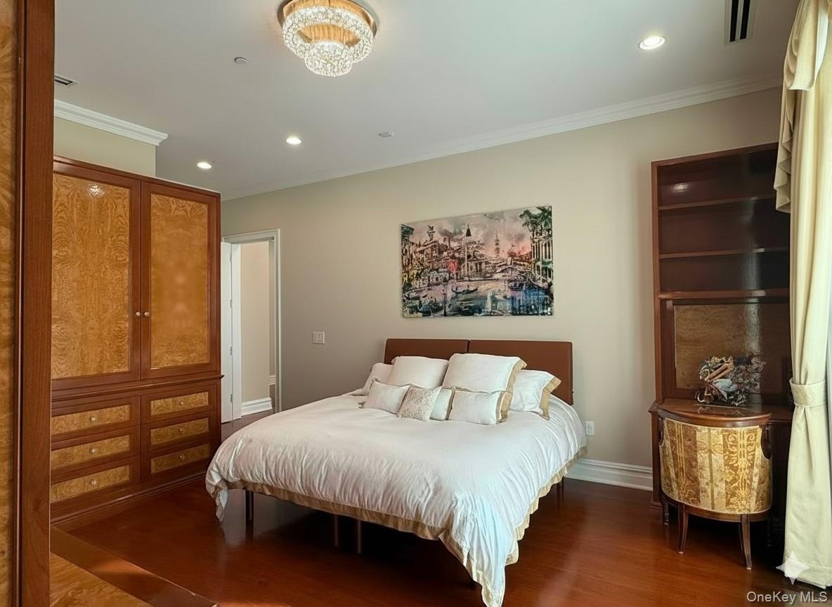 - Bedroom with ornamental molding, wood finished floors, recessed lighting, and a chandelier