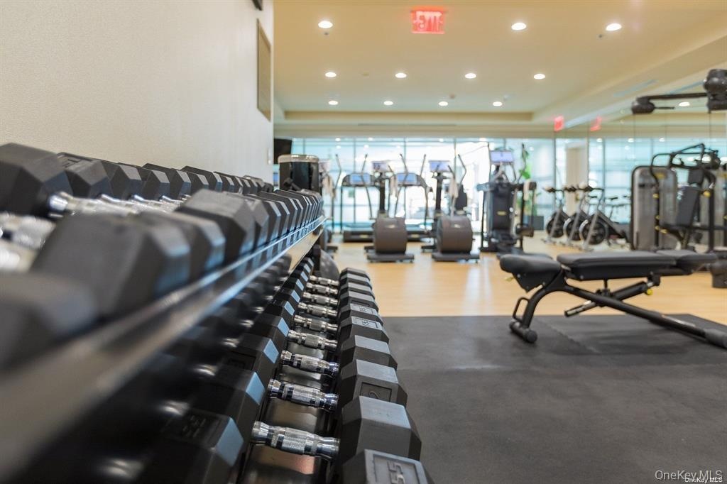 - Workout area with recessed lighting and floor to ceiling windows