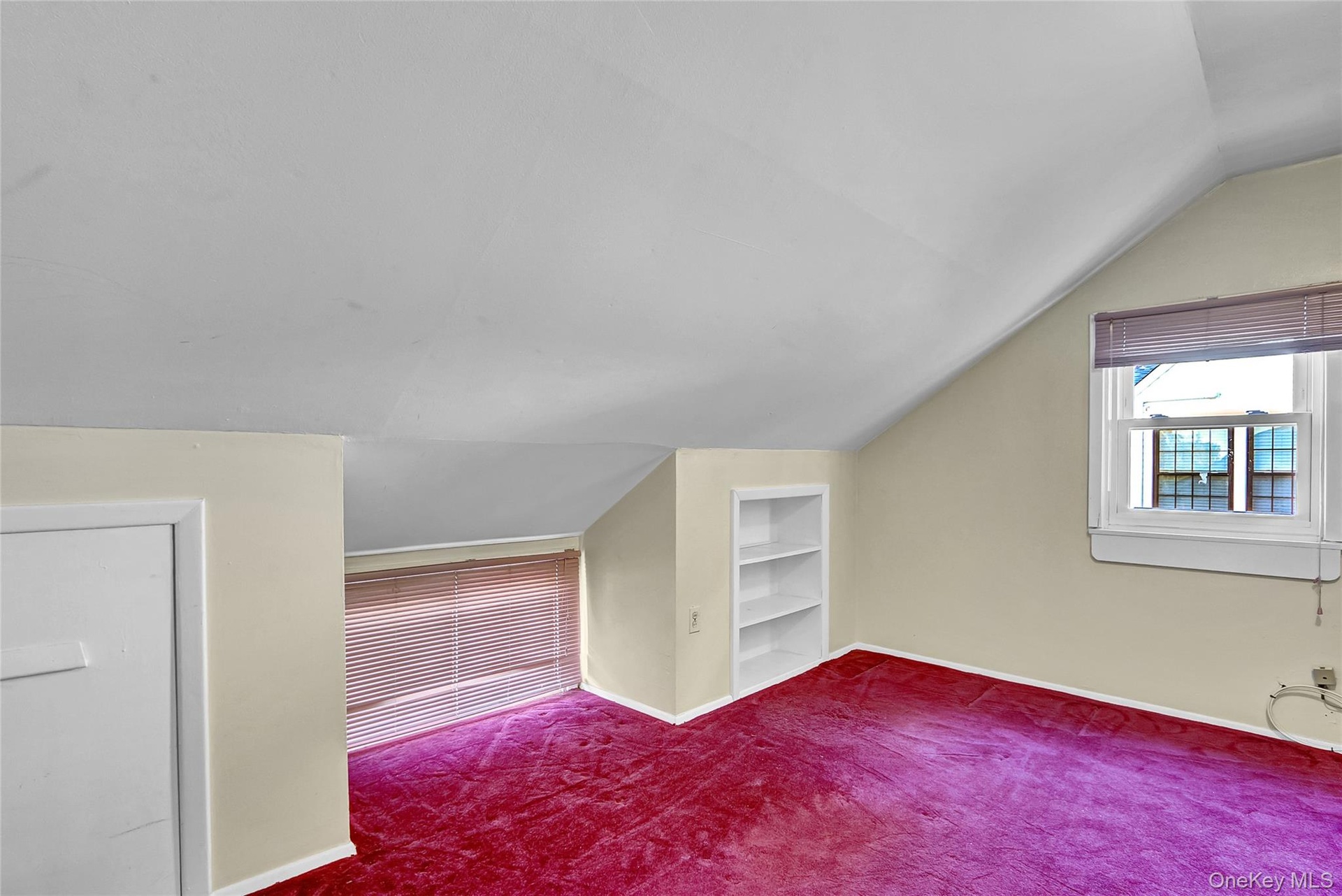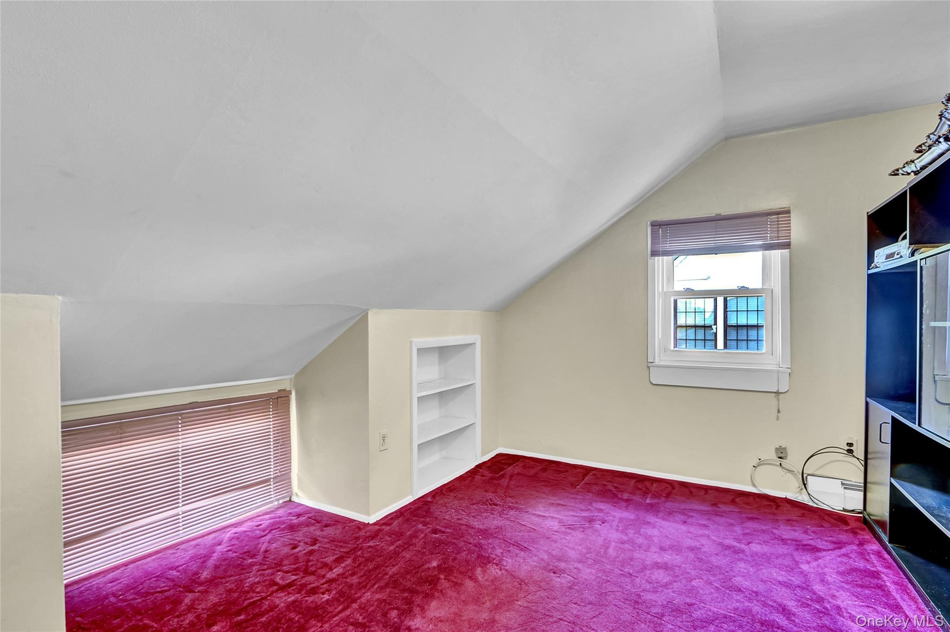 - Additional living space featuring built in shelves, vaulted ceiling, and carpet floors