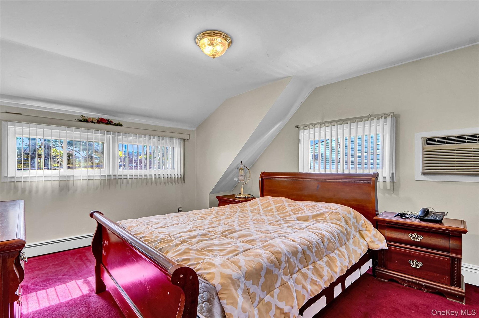- Bedroom with a baseboard radiator, vaulted ceiling, and a wall mounted air conditioner