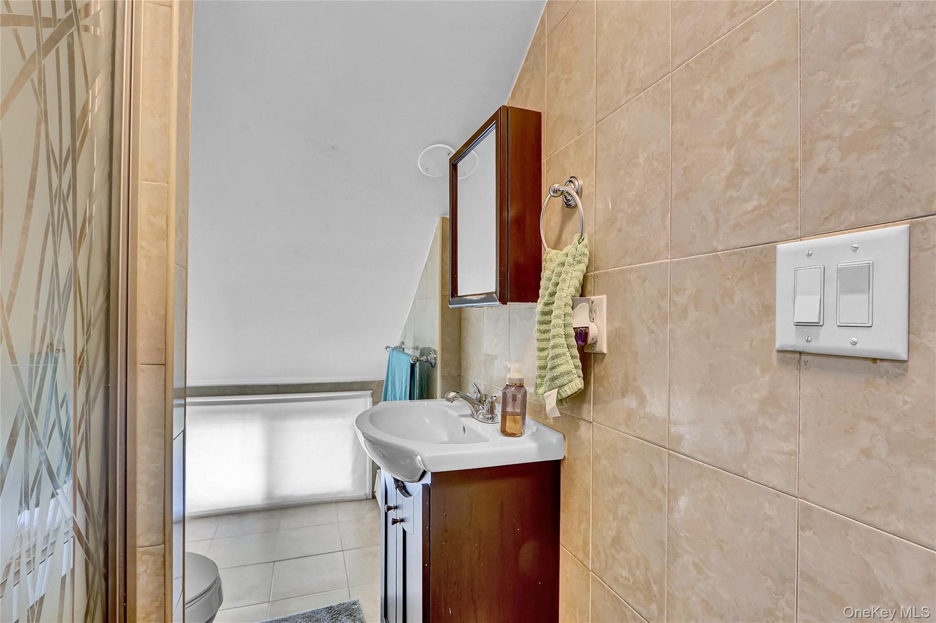 - Bathroom featuring tile walls, vanity, and light tile patterned floors