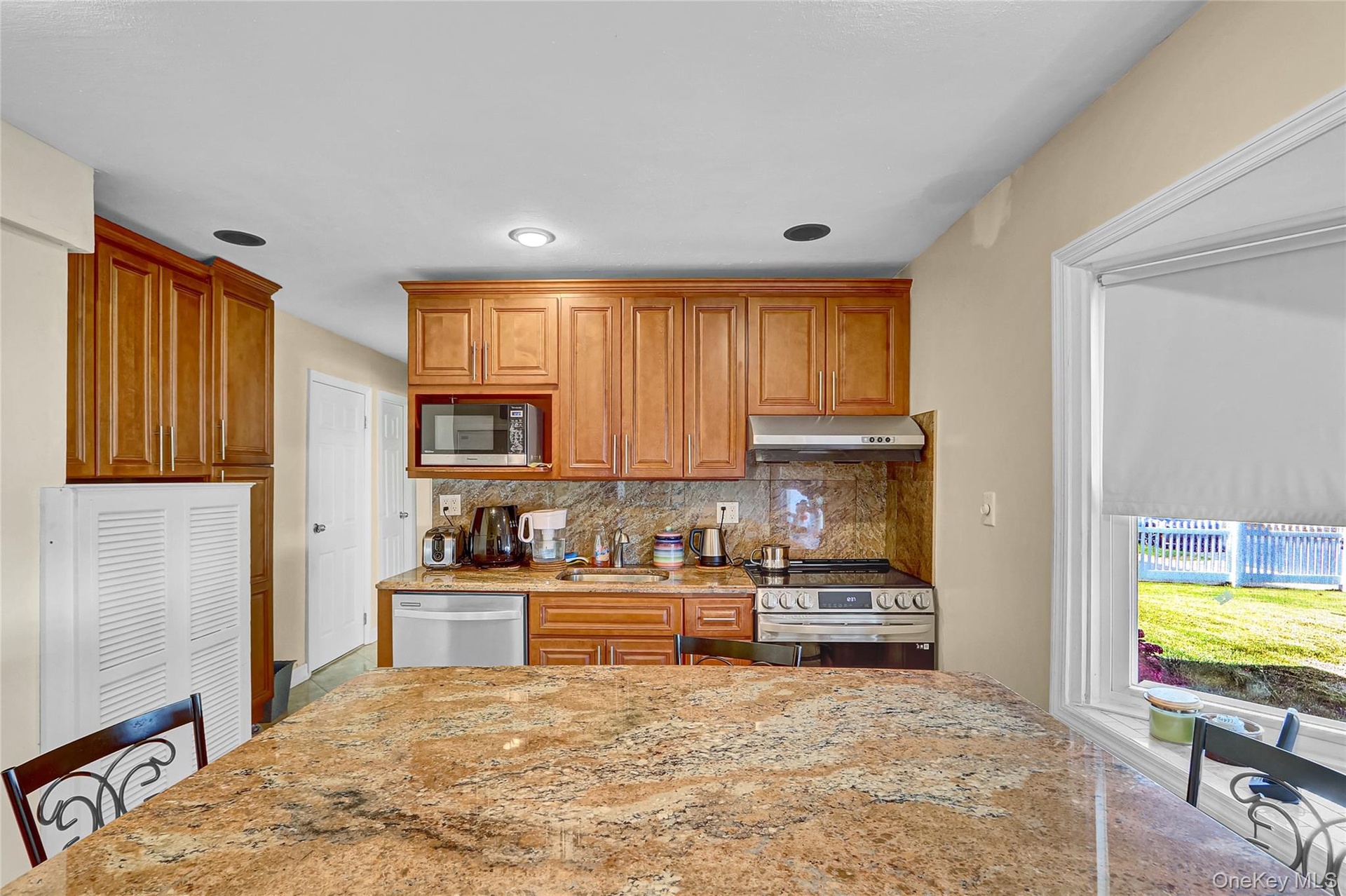 - Kitchen with light stone counters, brown cabinets, a kitchen breakfast bar, tasteful backsplash, and stainless steel appliances